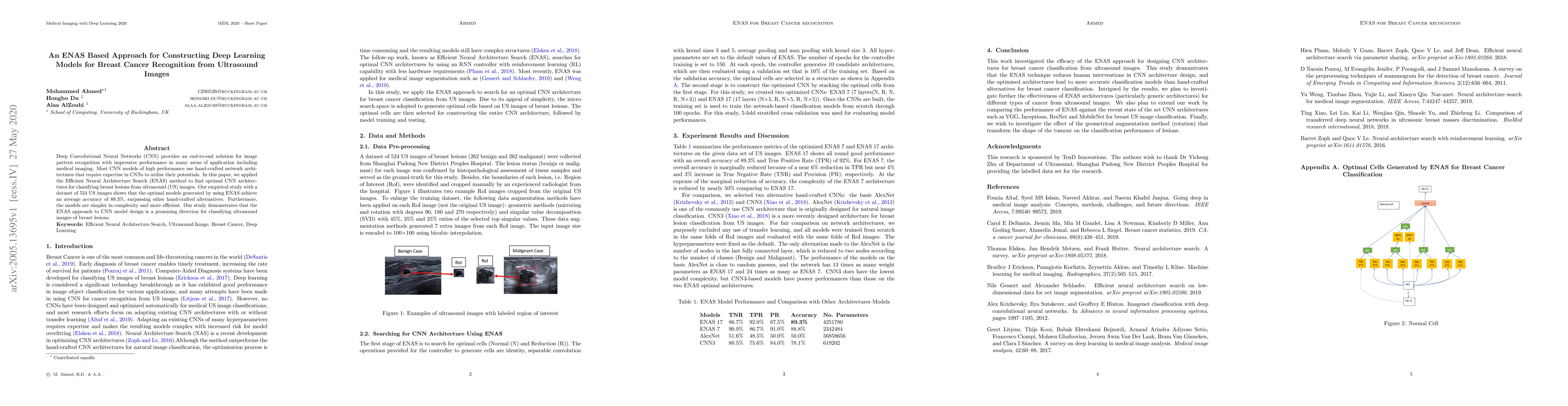 This paper utilizes Efficient Neural Architecture Search (ENAS) to develop optimal Deep Convolutional Neural Networks (CNN) for classifying breast lesions from ultrasound images, achieving an average accuracy of 89.3%. The ENAS-generated models outperform hand-crafted alternatives and are simpler and more efficient.