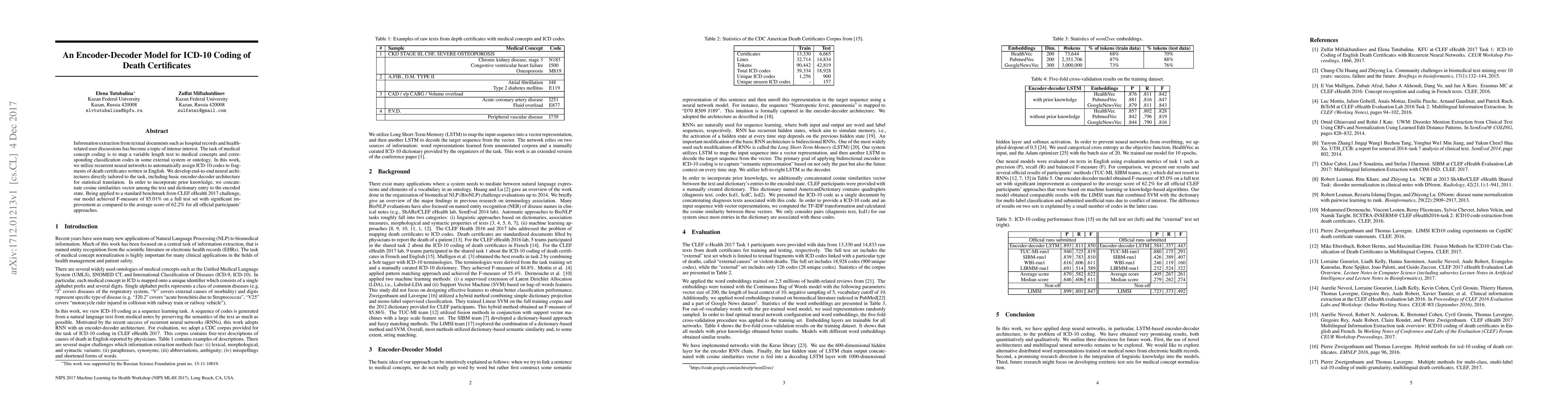 Information extraction from textual documents such as hospital records and healthrelated user discussions has become a topic of intense interest. The task of medical concept coding is to map a variable length text to medical concepts and corresponding classification codes in some external system or ontology. In this work, we utilize recurrent neural networks to automatically assign ICD-10 codes to fragments of death certificates written in English. We develop end-to-end neural architectures directly tailored to the task, including basic encoder-decoder architecture for statistical translation. In order to incorporate prior knowledge, we concatenate cosine similarities vector among the text and dictionary entry to the encoded state. Being applied to a standard benchmark from CLEF eHealth 2017 challenge, our model achieved F-measure of 85.01% on a full test set with significant improvement as compared to the average score of 62.2% for all official participants approaches.