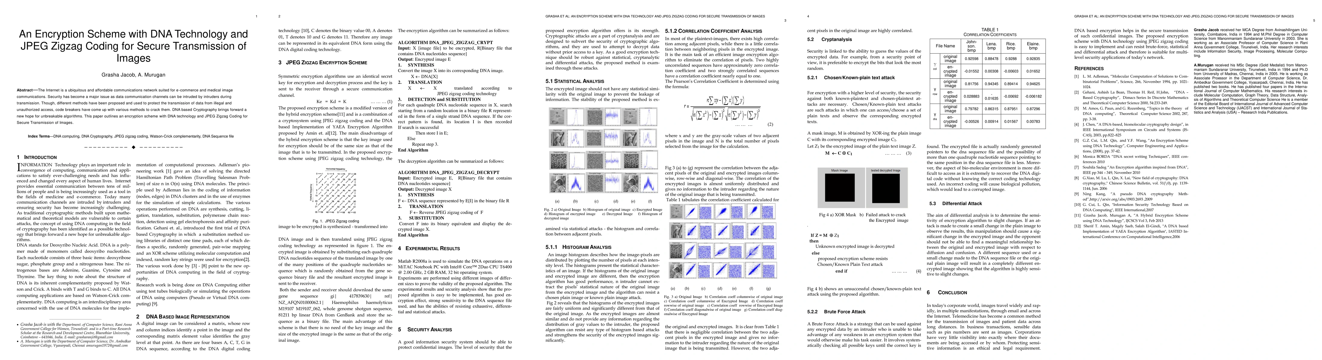 The Internet is a ubiquitous and affordable communications network suited for e-commerce and medical image communications. Security has become a major issue as data communication channels can be intruded by intruders during transmission. Though, different methods have been proposed and used to protect the transmission of data from illegal and unauthorized access, code breakers have come up with various methods to crack them. DNA based Cryptography brings forward a new hope for unbreakable algorithms. This paper outlines an encryption scheme with DNA technology and JPEG Zigzag Coding for Secure Transmission of Images.