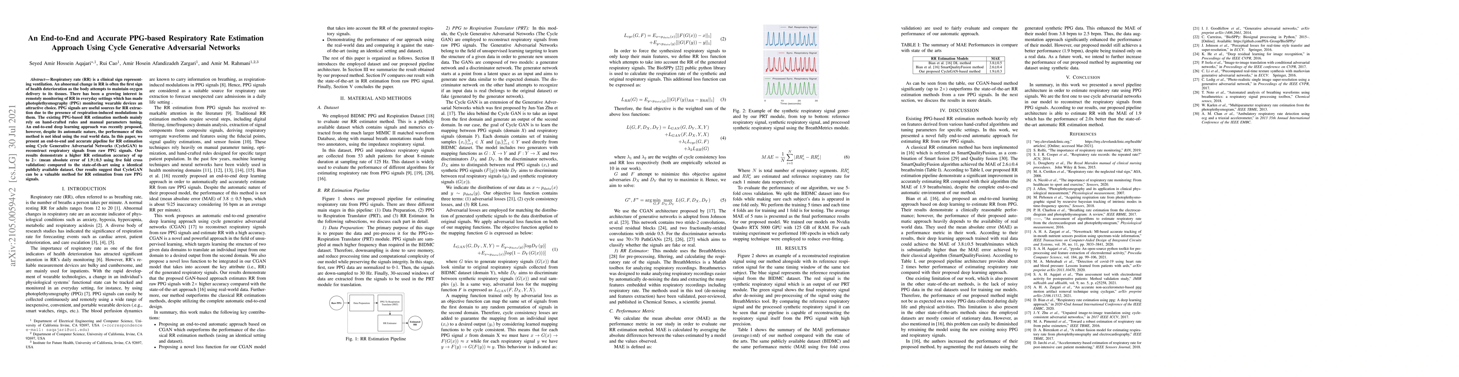 This paper proposes an end-to-end deep learning method using Cycle Generative Adversarial Networks (CycleGAN) to accurately estimate respiratory rate from photoplethysmography (PPG) signals, achieving up to twice the accuracy of existing methods. The approach demonstrates a mean absolute error of 1.9±0.3 using five-fold cross-validation.