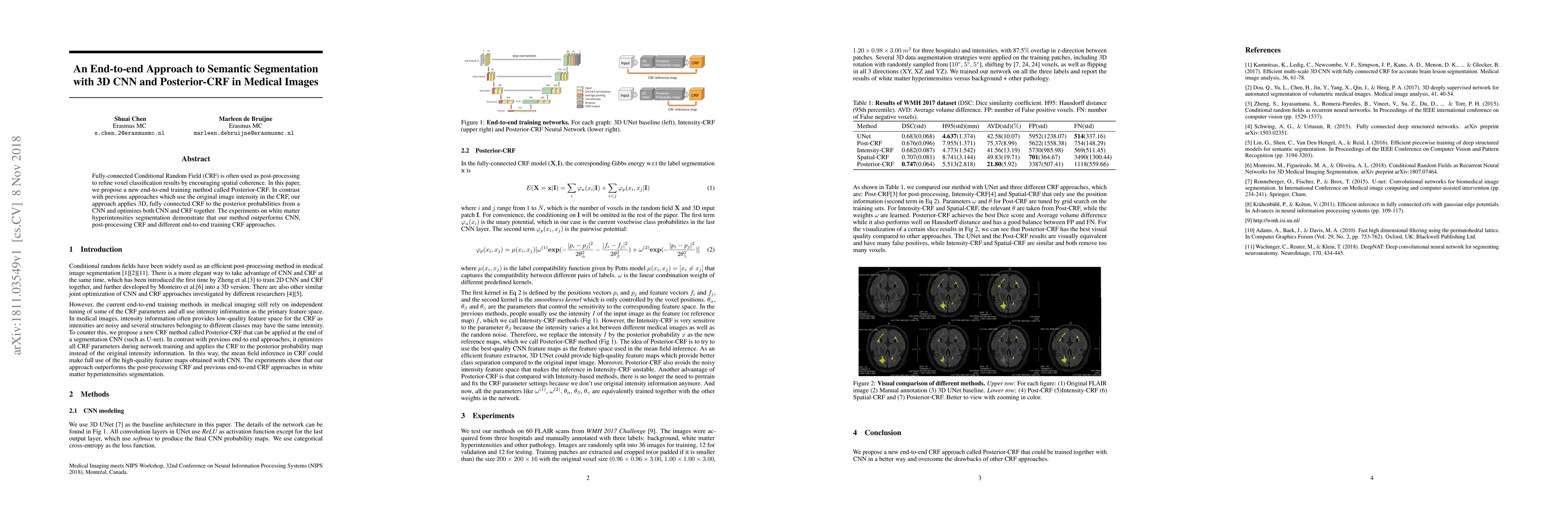 This paper introduces a novel end-to-end training method called Posterior-CRF, combining 3D CNN and fully connected CRF to refine voxel classification in medical images. Unlike traditional methods, it optimizes both CNN and CRF using posterior probabilities, achieving superior performance in white matter hyperintensities segmentation.