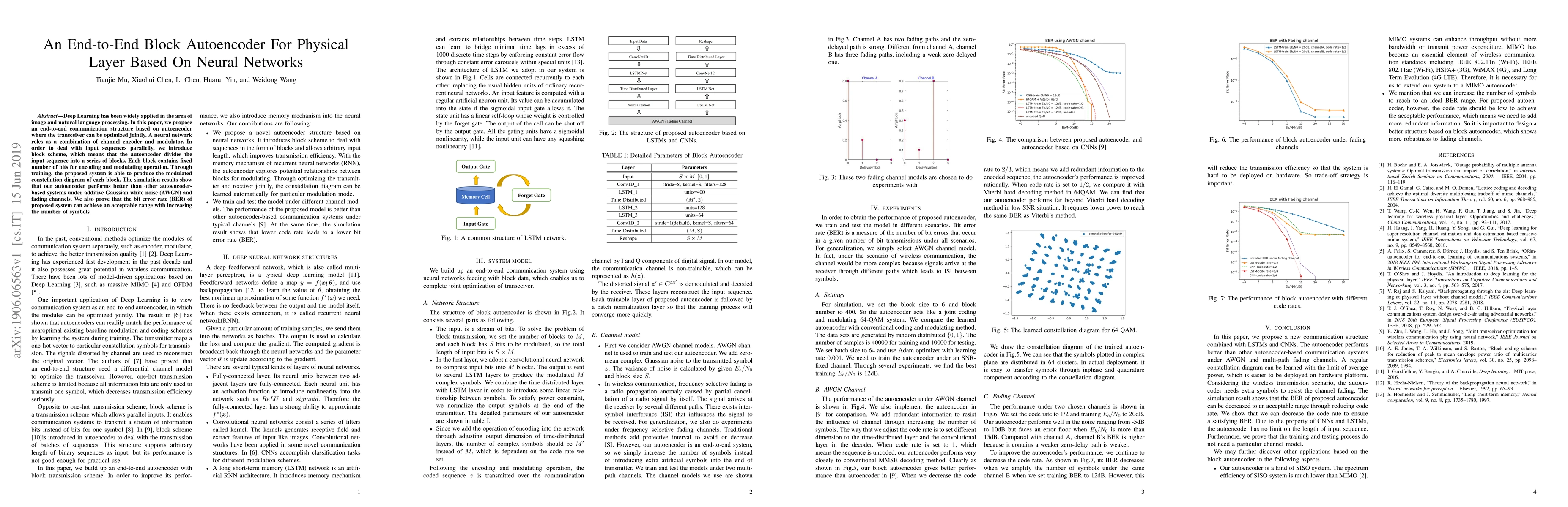 This paper proposes an end-to-end neural network-based block autoencoder for physical layer optimization in communication systems. The system divides input sequences into blocks for parallel processing and achieves better performance than other autoencoder-based systems under various channel conditions, demonstrating reduced bit error rates.
