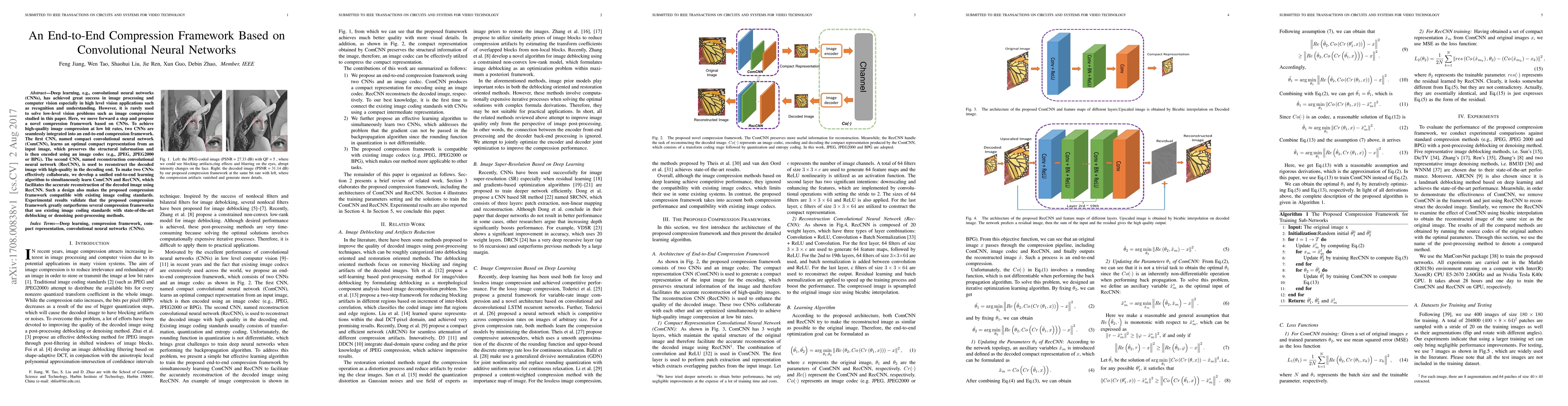 This paper proposes an end-to-end image compression framework using convolutional neural networks (CNNs), integrating a compact representation CNN (ComCNN) and a reconstruction CNN (RecCNN) to achieve high-quality image compression at low bit rates, outperforming existing methods. The unified learning algorithm enables effective collaboration between the two CNNs.