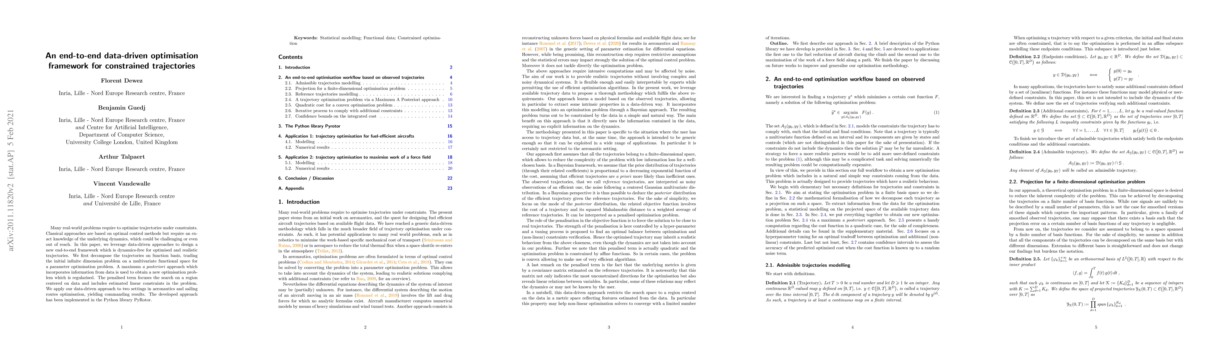 Many real-world problems require to optimise trajectories under constraints. Classical approaches are based on optimal control methods but require an exact knowledge of the underlying dynamics, which could be challenging or even out of reach. In this paper, we leverage data-driven approaches to design a new end-to-end framework which is dynamics-free for optimised and realistic trajectories. We first decompose the trajectories on function basis, trading the initial infinite dimension problem on a multivariate functional space for a parameter optimisation problem. A maximum \emph{a posteriori} approach which incorporates information from data is used to obtain a new optimisation problem which is regularised. The penalised term focuses the search on a region centered on data and includes estimated linear constraints in the problem. We apply our data-driven approach to two settings in aeronautics and sailing routes optimisation, yielding commanding results. The developed approach has been implemented in the Python library PyRotor.