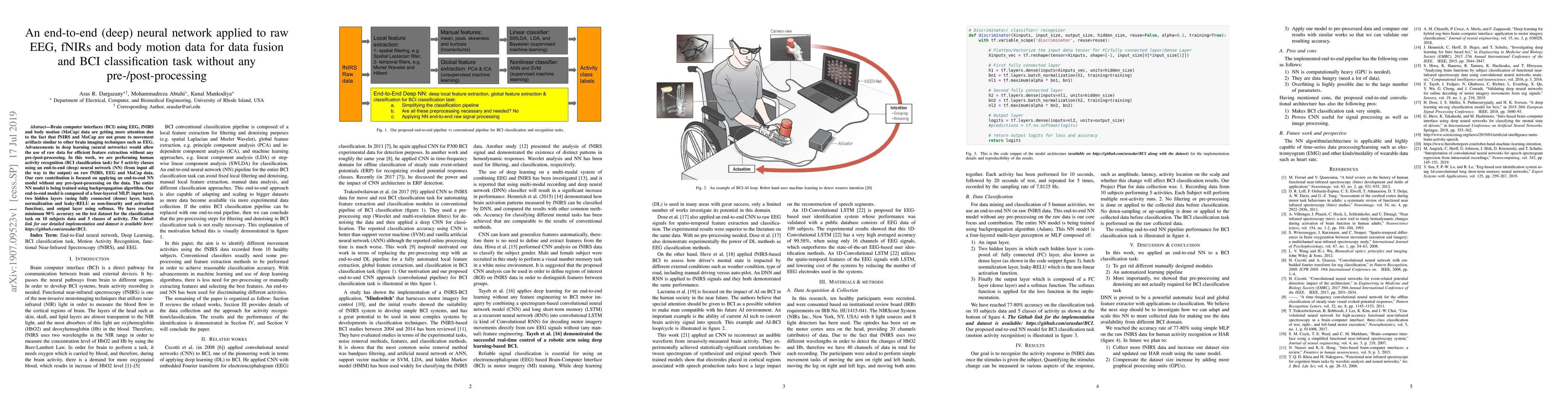 This paper presents an end-to-end deep neural network for classifying human activities using raw EEG, fNIRS, and body motion data without any pre- or post-processing. The model achieves at least 90% accuracy on a test dataset for a BCI classification task involving five activity classes.