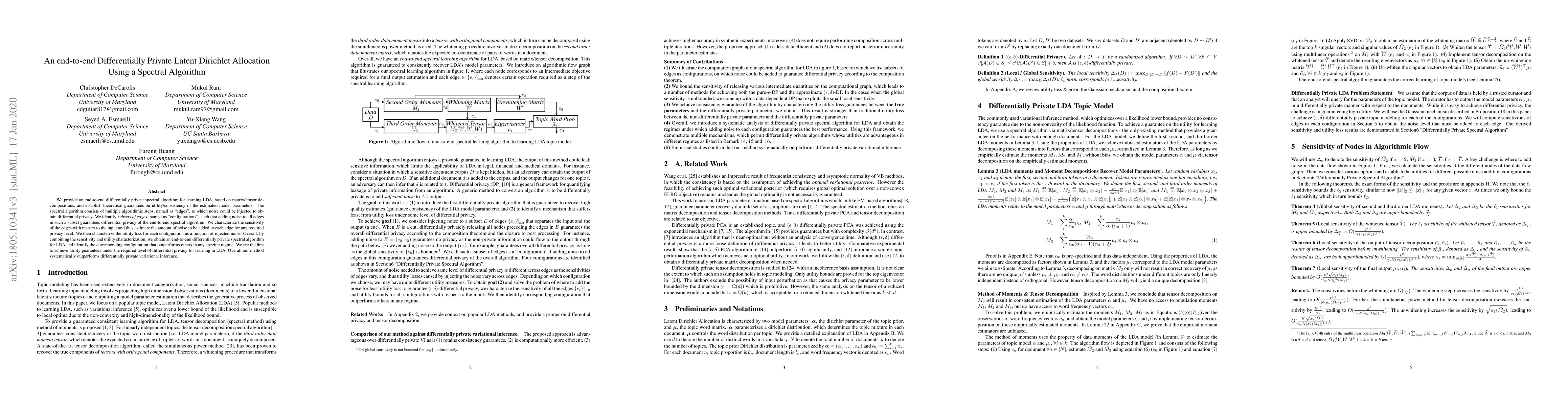 We provide an end-to-end differentially private spectral algorithm for learning LDA, based on matrix/tensor decompositions, and establish theoretical guarantees on utility/consistency of the estimated model parameters. The spectral algorithm consists of multiple algorithmic steps, named as "{edges}", to which noise could be injected to obtain differential privacy. We identify \emph{subsets of edges}, named as "{configurations}", such that adding noise to all edges in such a subset guarantees differential privacy of the end-to-end spectral algorithm. We characterize the sensitivity of the edges with respect to the input and thus estimate the amount of noise to be added to each edge for any required privacy level. We then characterize the utility loss for each configuration as a function of injected noise. Overall, by combining the sensitivity and utility characterization, we obtain an end-to-end differentially private spectral algorithm for LDA and identify the corresponding configuration that outperforms others in any specific regime. We are the first to achieve utility guarantees under the required level of differential privacy for learning in LDA. Overall our method systematically outperforms differentially private variational inference.
