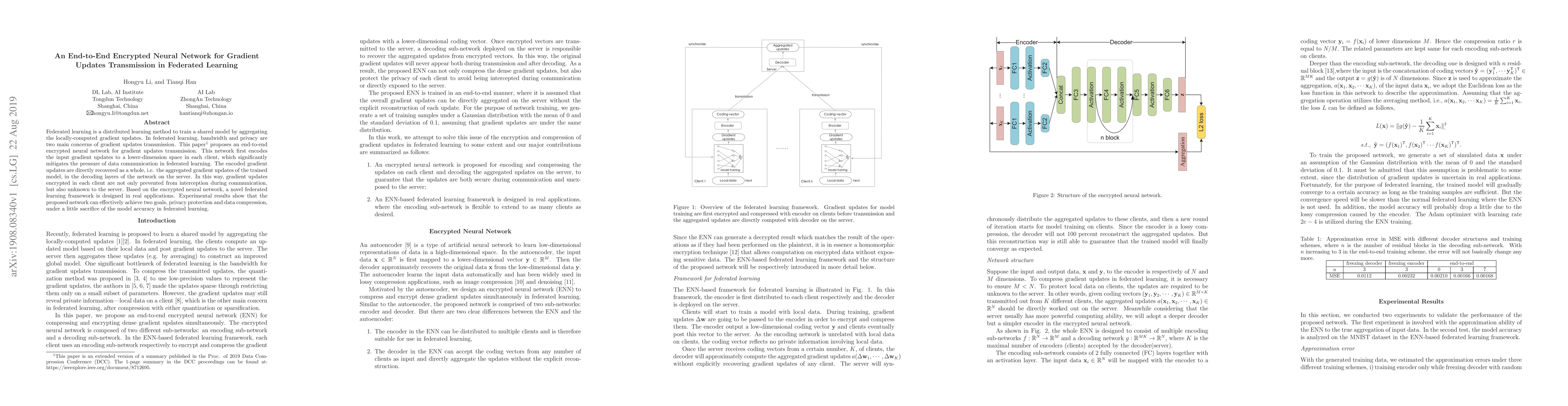 Federated learning is a distributed learning method to train a shared model by aggregating the locally-computed gradient updates. In federated learning, bandwidth and privacy are two main concerns of gradient updates transmission. This paper proposes an end-to-end encrypted neural network for gradient updates transmission. This network first encodes the input gradient updates to a lower-dimension space in each client, which significantly mitigates the pressure of data communication in federated learning. The encoded gradient updates are directly recovered as a whole, i.e. the aggregated gradient updates of the trained model, in the decoding layers of the network on the server. In this way, gradient updates encrypted in each client are not only prevented from interception during communication, but also unknown to the server. Based on the encrypted neural network, a novel federated learning framework is designed in real applications. Experimental results show that the proposed network can effectively achieve two goals, privacy protection and data compression, under a little sacrifice of the model accuracy in federated learning.