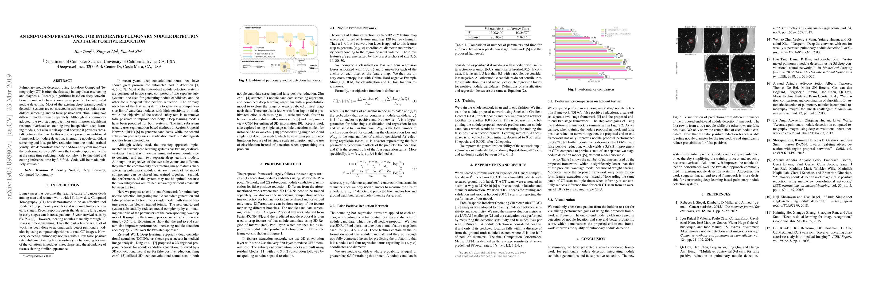This paper proposes an end-to-end framework for integrated pulmonary nodule detection and false positive reduction using deep learning, which combines nodule screening and false positive reduction into a single model. The integrated approach outperforms the traditional two-step method by 3.88% while reducing model complexity and inference time.