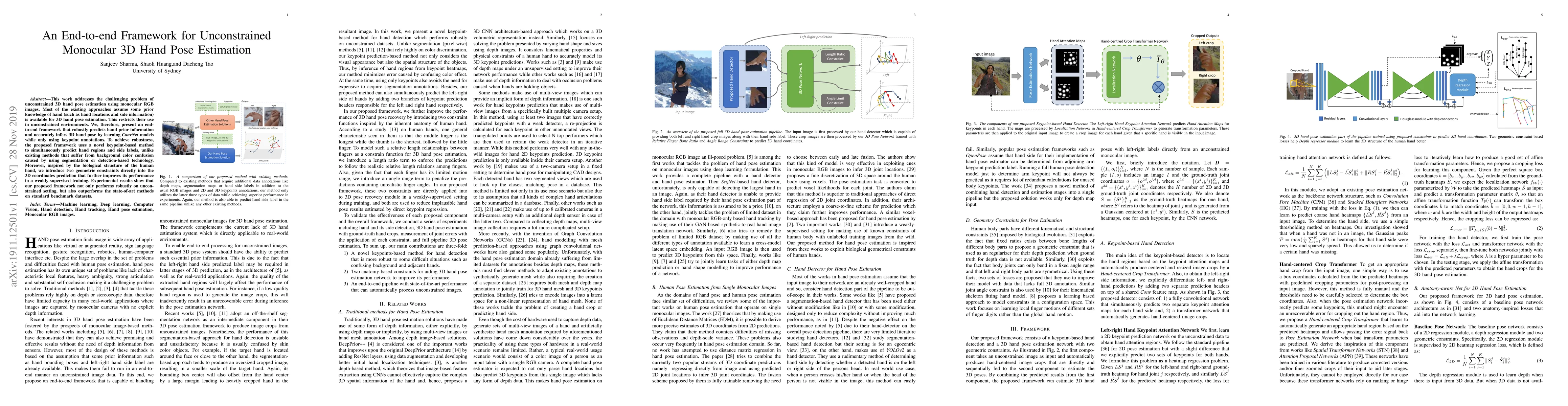 This paper proposes an end-to-end framework for unconstrained 3D hand pose estimation from monocular RGB images, utilizing ConvNets and keypoint annotations without prior hand location knowledge. The framework incorporates geometric constraints and a novel keypoint-based method to enhance robustness and outperforms existing methods on benchmark datasets.
