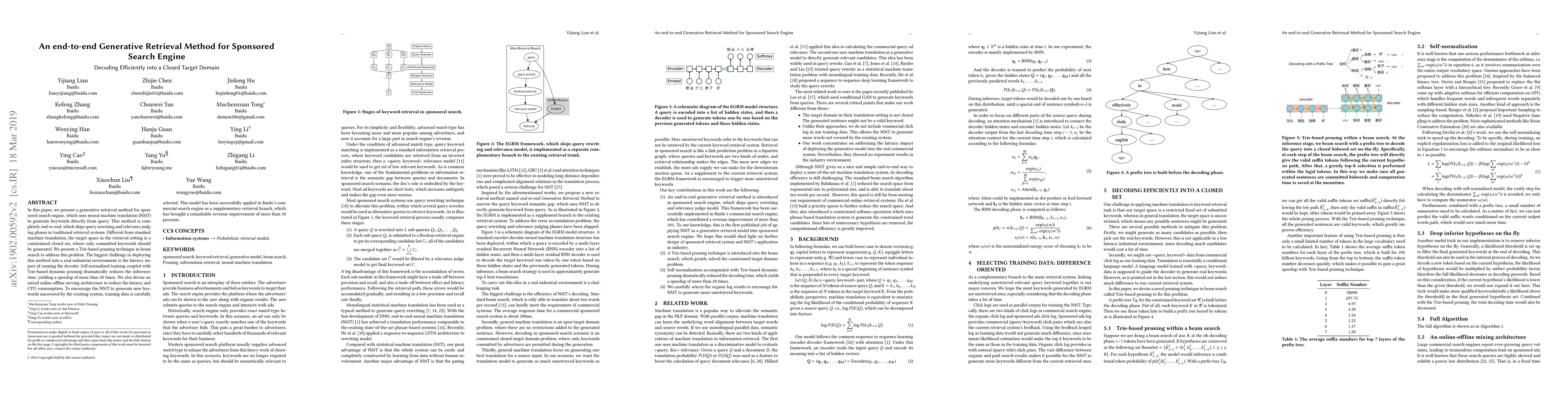 This paper introduces a generative retrieval method for sponsored search engines using neural machine translation to generate keywords directly from queries, bypassing traditional query rewriting and relevance judging. The method employs a Trie-based pruning technique to efficiently manage a constrained closed target domain, significantly reducing latency through self-normalized training and dynamic pruning.