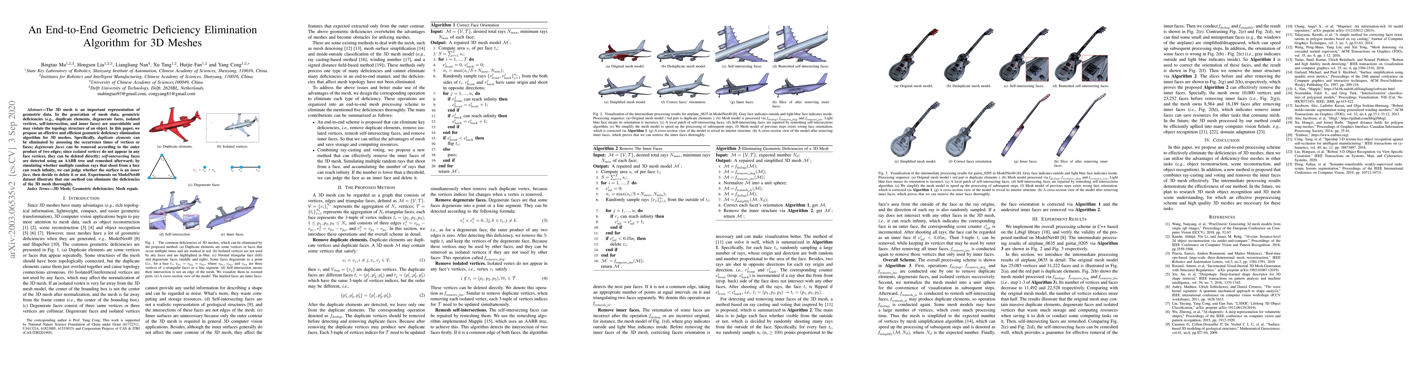 This paper proposes an algorithm to eliminate common geometric deficiencies in 3D meshes, including duplicates, degeneracies, isolated vertices, self-intersections, and inner faces, with promising results on the ModelNet40 dataset.
