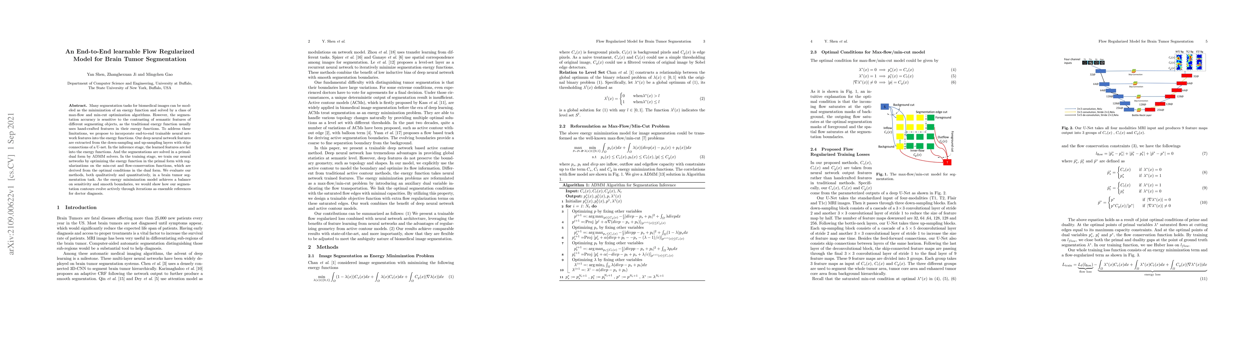 This research paper proposes a new method for brain tumor segmentation that uses end-to-end trainable neural networks to improve accuracy and smooth boundaries. It achieves this through an energy minimization model with regularizations on flow-conservation functions.
