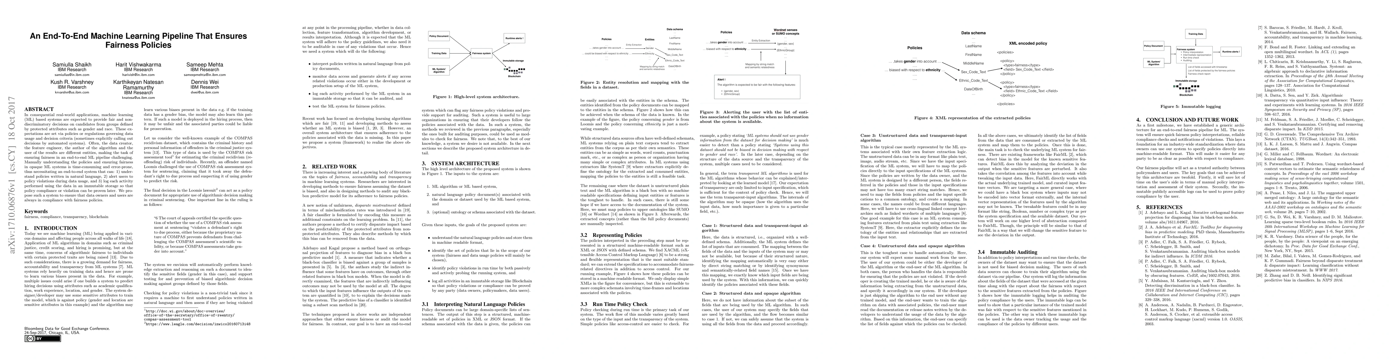 This paper proposes an end-to-end machine learning system designed to ensure compliance with fairness policies, automatically interpreting natural language policies, alerting users of violations, and logging data activities for auditability. The system aims to simplify fairness enforcement across diverse stakeholders in ML pipelines.