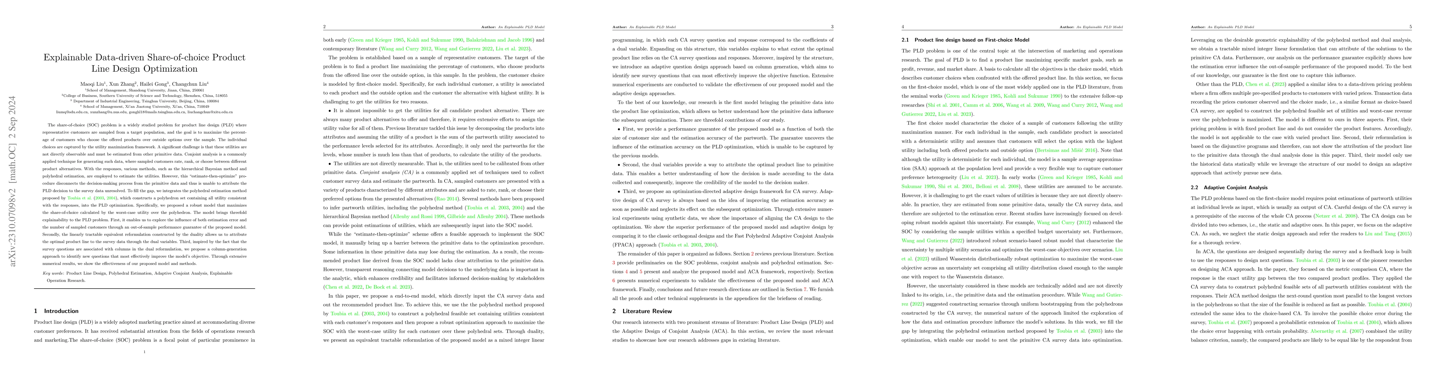 This paper proposes an end-to-end model for optimizing share-of-choice product line design using polyhedral methods and robust optimization, providing guarantees on market share. It introduces an adaptive conjoint analysis to refine survey questions, demonstrating superior performance over traditional models through numerical experiments.