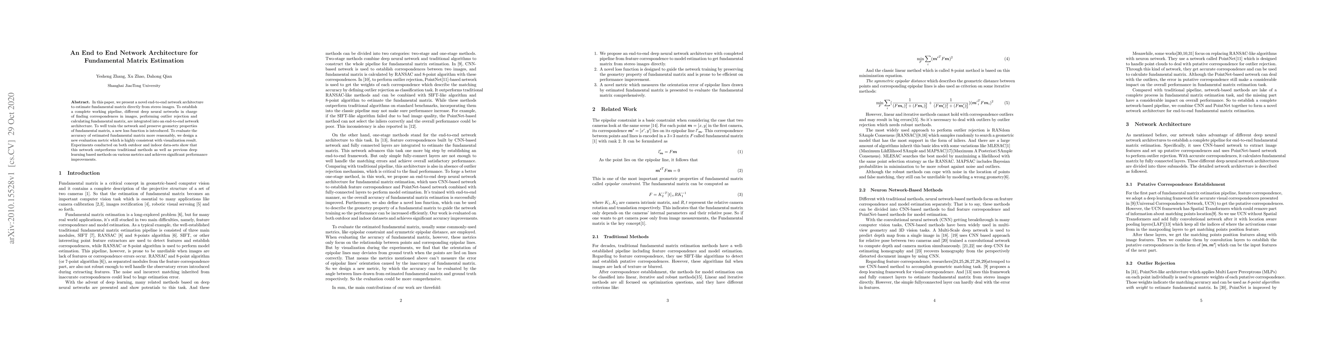 This paper introduces an end-to-end neural network architecture for directly estimating the fundamental matrix from stereo images, integrating correspondence finding, outlier rejection, and matrix calculation. The network is trained with a new loss function and evaluated using a metric aligned with visualization results, demonstrating superior performance over traditional and previous deep learning methods.