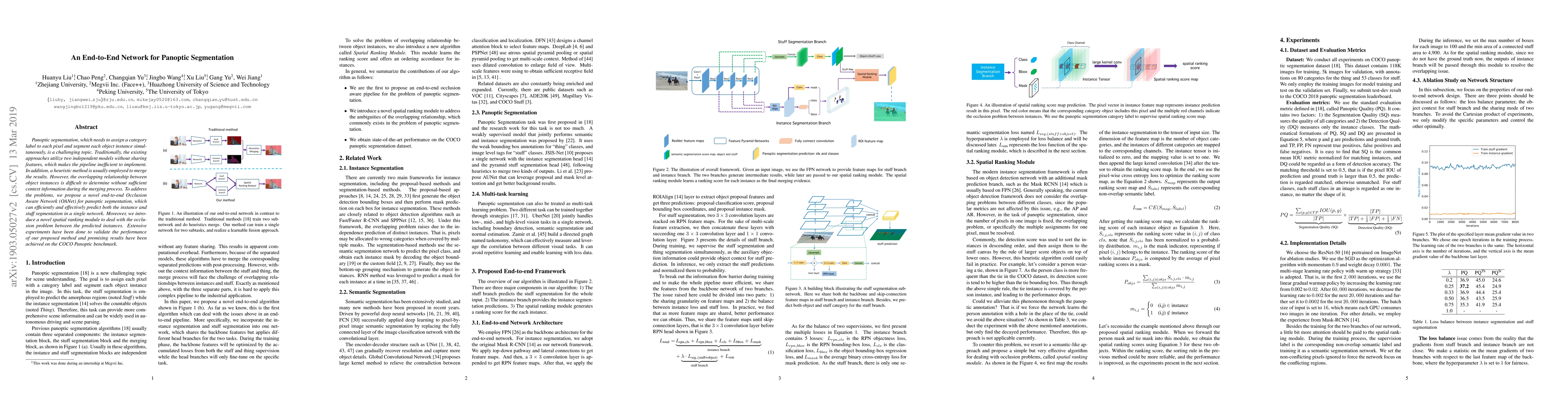 Panoptic segmentation, which needs to assign a category label to each pixel and segment each object instance simultaneously, is a challenging topic. Traditionally, the existing approaches utilize two independent models without sharing features, which makes the pipeline inefficient to implement. In addition, a heuristic method is usually employed to merge the results. However, the overlapping relationship between object instances is difficult to determine without sufficient context information during the merging process. To address the problems, we propose a novel end-to-end network for panoptic segmentation, which can efficiently and effectively predict both the instance and stuff segmentation in a single network. Moreover, we introduce a novel spatial ranking module to deal with the occlusion problem between the predicted instances. Extensive experiments have been done to validate the performance of our proposed method and promising results have been achieved on the COCO Panoptic benchmark.