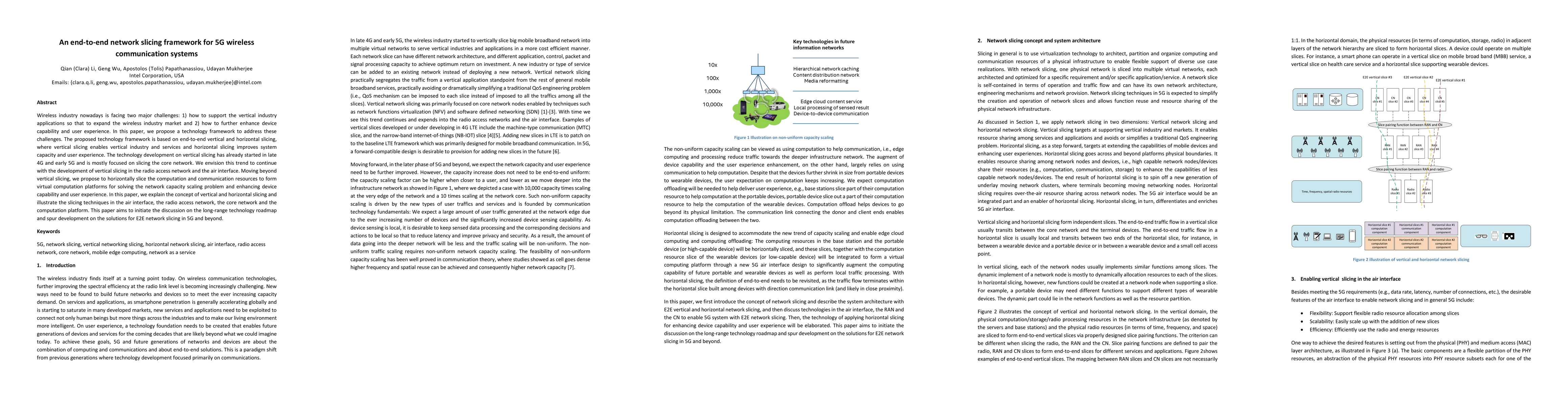 This paper proposes a comprehensive end-to-end network slicing framework for 5G wireless systems, addressing challenges in supporting vertical industry applications and enhancing user experience through vertical and horizontal slicing techniques. The framework aims to advance network capacity and device capability through resource virtualization.