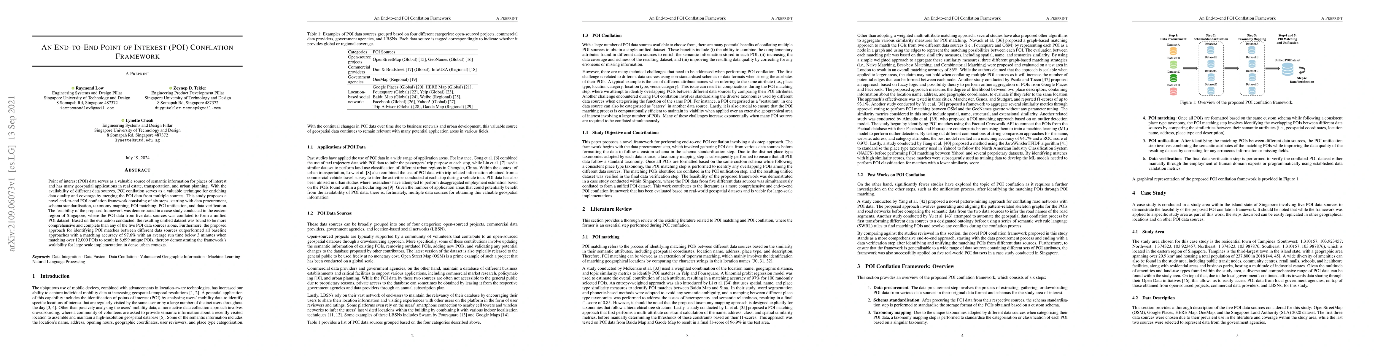 This study proposes an end-to-end POI conflation framework comprising six steps to merge POI data from multiple sources, resulting in a more comprehensive dataset. In a Singapore case study, the framework achieved a 97.6% matching accuracy and produced a complete POI dataset superior to individual sources.