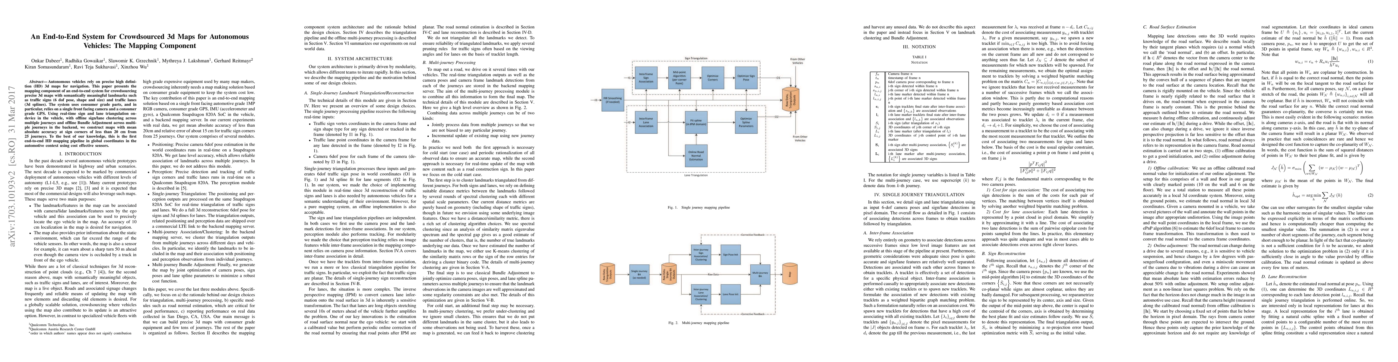 Autonomous vehicles rely on precise high definition (HD) 3d maps for navigation. This paper presents the mapping component of an end-to-end system for crowdsourcing precise 3d maps with semantically meaningful landmarks such as traffic signs (6 dof pose, shape and size) and traffic lanes (3d splines). The system uses consumer grade parts, and in particular, relies on a single front facing camera and a consumer grade GPS. Using real-time sign and lane triangulation on-device in the vehicle, with offline sign/lane clustering across multiple journeys and offline Bundle Adjustment across multiple journeys in the backend, we construct maps with mean absolute accuracy at sign corners of less than 20 cm from 25 journeys. To the best of our knowledge, this is the first end-to-end HD mapping pipeline in global coordinates in the automotive context using cost effective sensors.