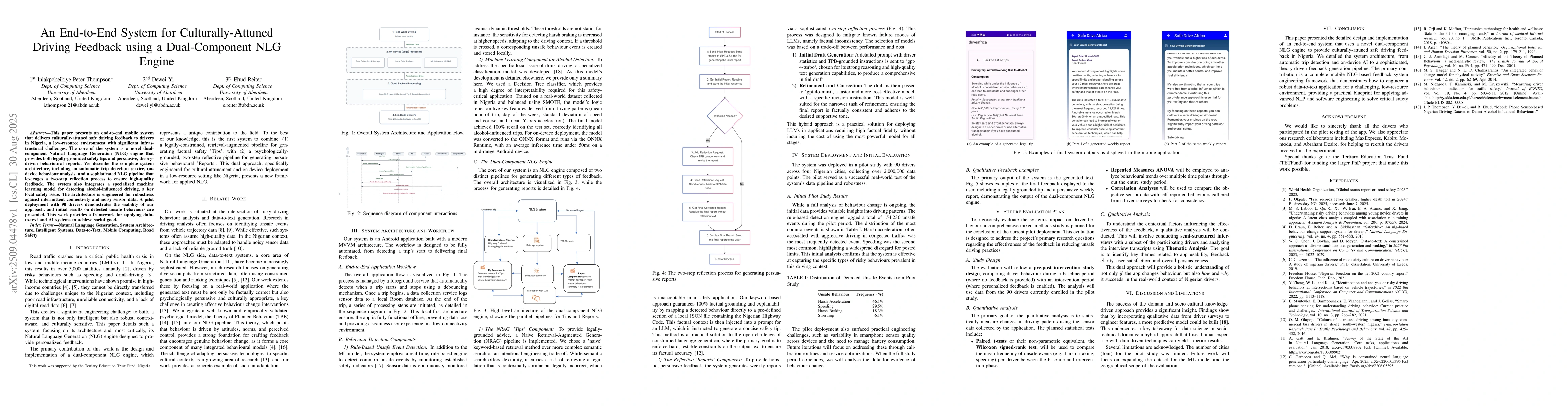 This paper presents an end-to-end mobile system that delivers culturally-attuned safe driving feedback to drivers in Nigeria, a low-resource environment with significant infrastructural challenges. The core of the system is a novel dual-component Natural Language Generation (NLG) engine that provides both legally-grounded safety tips and persuasive, theory-driven behavioural reports. We describe the complete system architecture, including an automatic trip detection service, on-device behaviour analysis, and a sophisticated NLG pipeline that leverages a two-step reflection process to ensure high-quality feedback. The system also integrates a specialized machine learning model for detecting alcohol-influenced driving, a key local safety issue. The architecture is engineered for robustness against intermittent connectivity and noisy sensor data. A pilot deployment with 90 drivers demonstrates the viability of our approach, and initial results on detected unsafe behaviours are presented. This work provides a framework for applying data-to-text and AI systems to achieve social good.