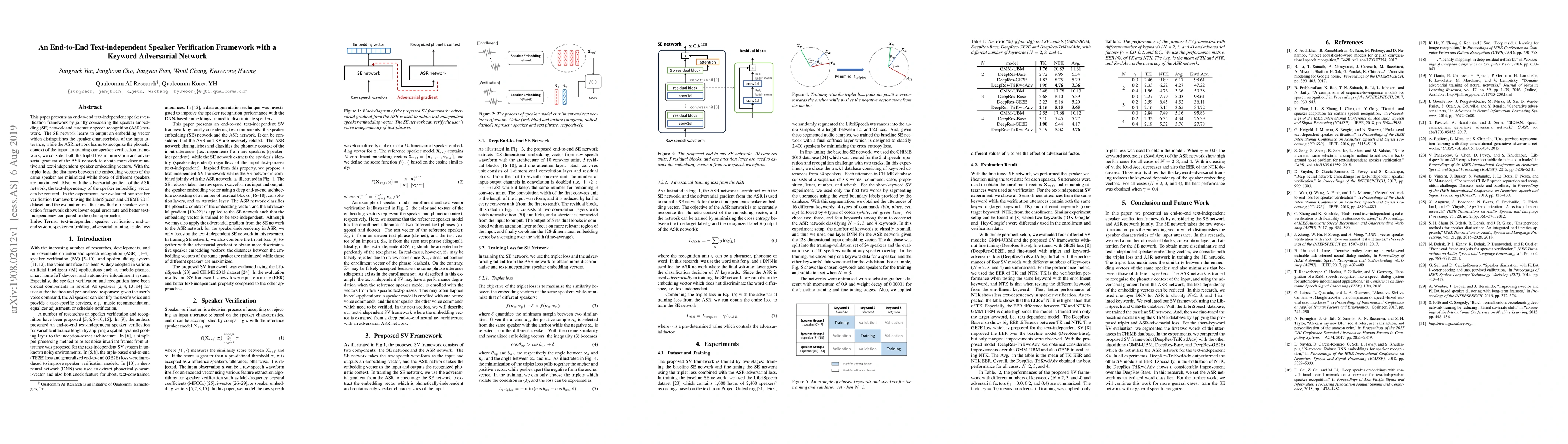 This paper proposes an end-to-end text-independent speaker verification framework combining speaker embedding and automatic speech recognition networks. The framework utilizes triplet loss and adversarial training to enhance discriminative and text-independent speaker embeddings, achieving lower error rates and better text-independence compared to other methods.