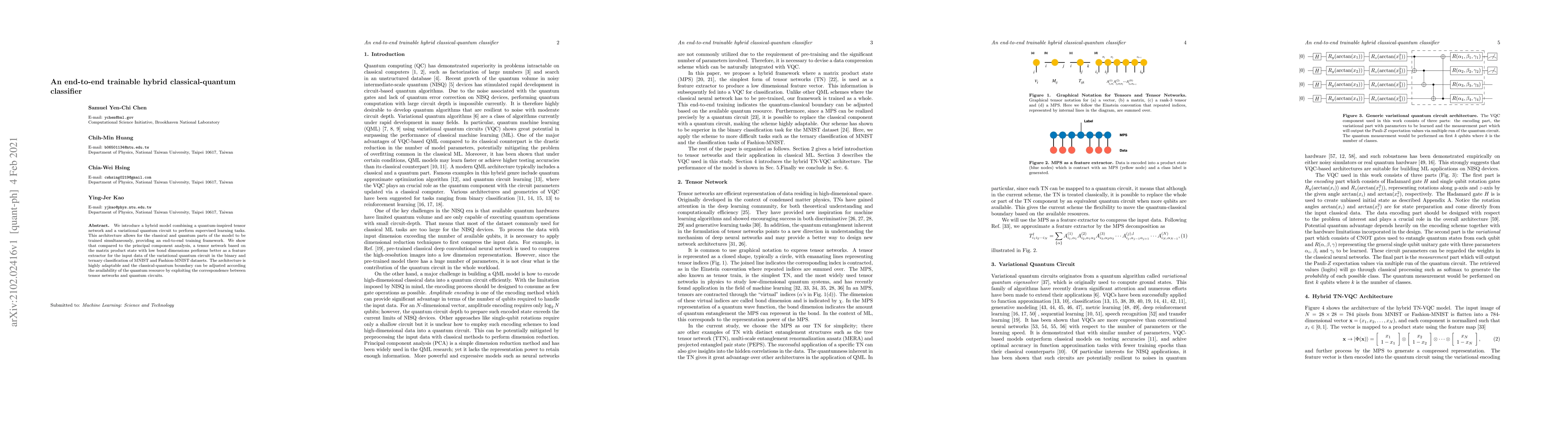 This paper presents a hybrid classical-quantum classifier that combines a quantum-inspired tensor network with a variational quantum circuit, enabling end-to-end training. The tensor network, specifically a matrix product state, outperforms principal component analysis as a feature extractor for classifying MNIST and Fashion-MNIST datasets.