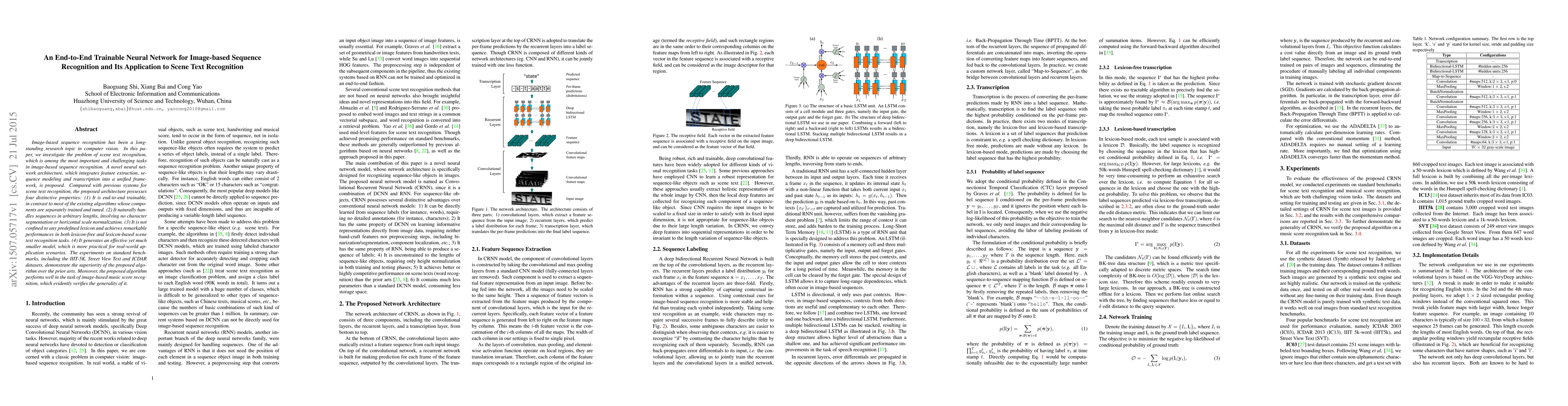 Image-based sequence recognition has been a long-standing research topic in computer vision. In this paper, we investigate the problem of scene text recognition, which is among the most important and challenging tasks in image-based sequence recognition. A novel neural network architecture, which integrates feature extraction, sequence modeling and transcription into a unified framework, is proposed. Compared with previous systems for scene text recognition, the proposed architecture possesses four distinctive properties: (1) It is end-to-end trainable, in contrast to most of the existing algorithms whose components are separately trained and tuned. (2) It naturally handles sequences in arbitrary lengths, involving no character segmentation or horizontal scale normalization. (3) It is not confined to any predefined lexicon and achieves remarkable performances in both lexicon-free and lexicon-based scene text recognition tasks. (4) It generates an effective yet much smaller model, which is more practical for real-world application scenarios. The experiments on standard benchmarks, including the IIIT-5K, Street View Text and ICDAR datasets, demonstrate the superiority of the proposed algorithm over the prior arts. Moreover, the proposed algorithm performs well in the task of image-based music score recognition, which evidently verifies the generality of it.