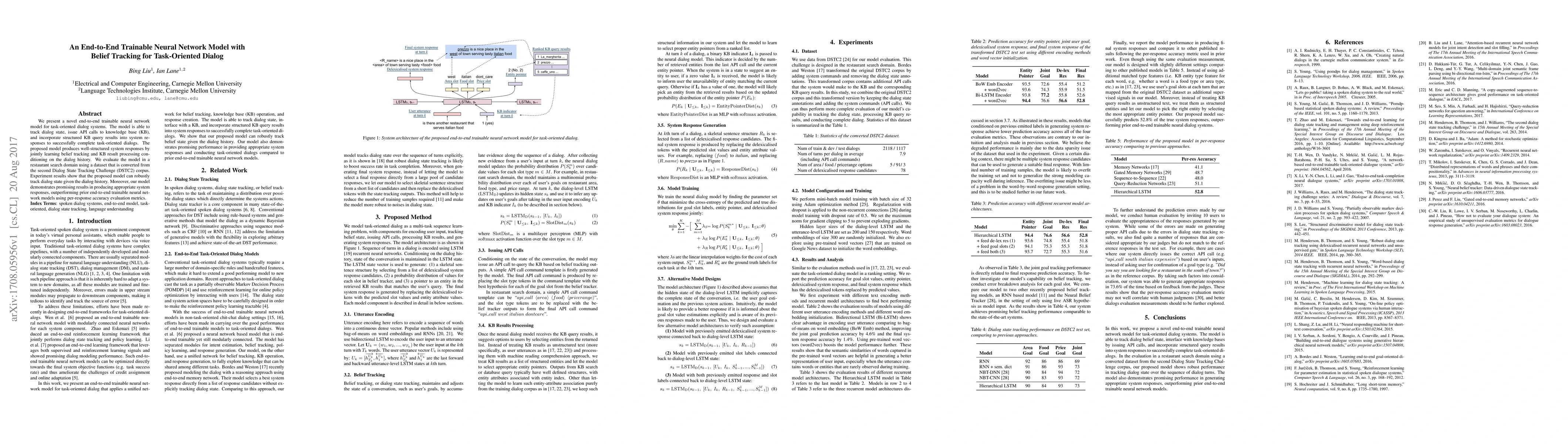 This paper introduces an end-to-end neural network model for task-oriented dialog systems that effectively tracks dialog state and integrates knowledge base query results into responses. The model outperforms previous models in generating accurate system responses in a restaurant search domain, based on evaluation metrics.