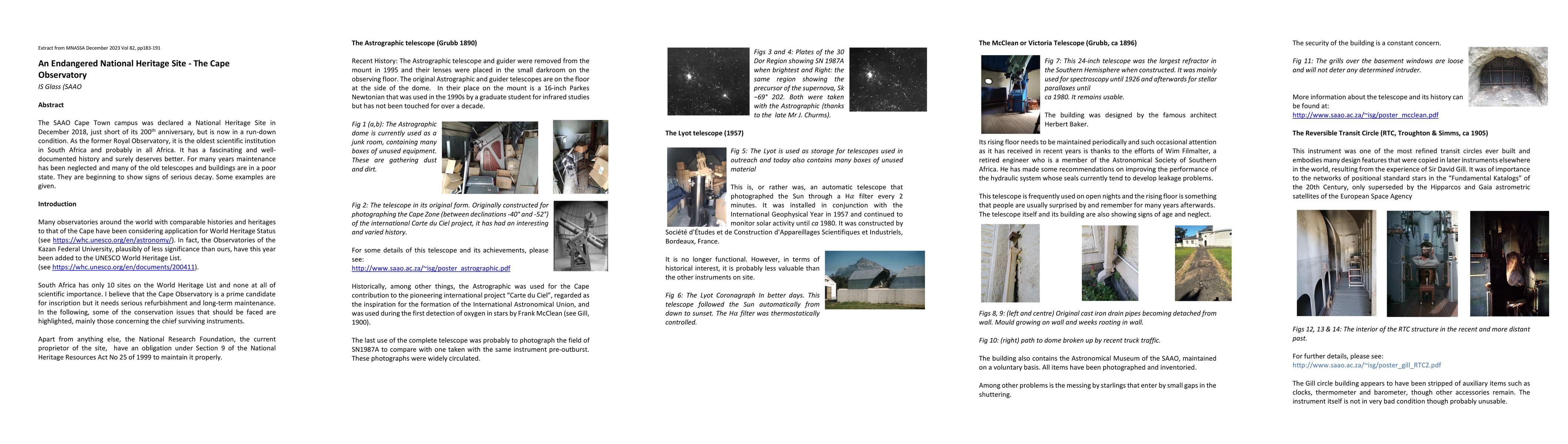 The Cape Observatory, South Africa's oldest scientific institution and a National Heritage Site, is in a run-down condition despite its 200-year history and significant historical value. Neglected maintenance has led to serious decay in its telescopes and buildings.