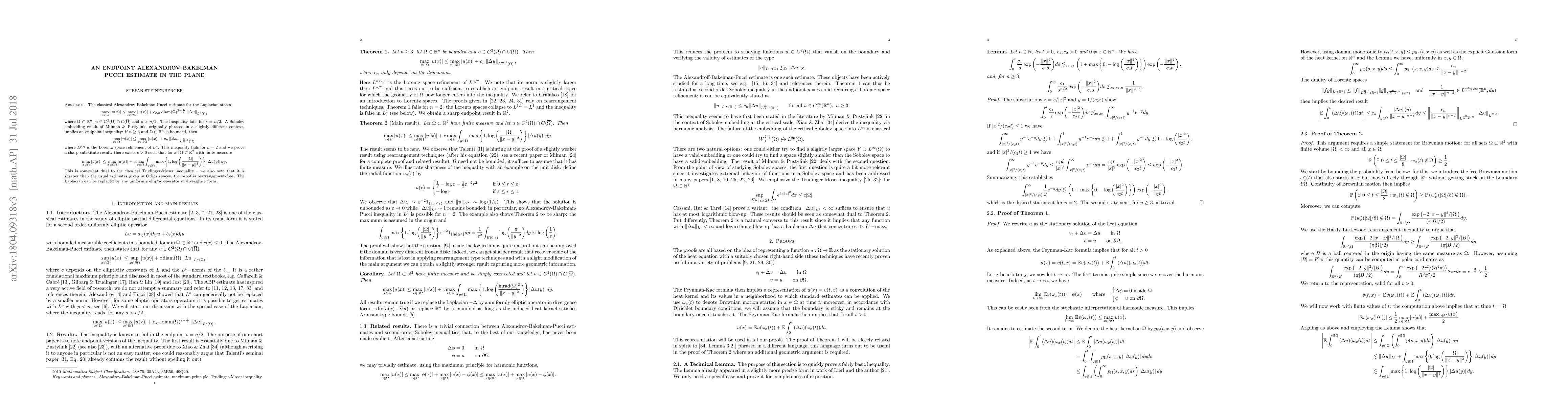 The classical Alexandrov-Bakelman-Pucci estimate for the Laplacian states $$ \max_{x \in \Omega}{ |u(x)|} \leq \max_{x \in \partial \Omega}{|u(x)|} + c_{s,n} \mbox{diam}(\Omega)^{2-\frac{n}{s}} \left\| \Delta u\right\|_{L^s(\Omega)}$$ where $\Omega \subset \mathbb{R}^n$, $u \in C^2(\Omega) \cap C(\overline{\Omega})$ and $s > n/2$. The inequality fails for $s = n/2$. A Sobolev embedding result of Milman & Pustylink, originally phrased in a slightly different context, implies an endpoint inequality: if $n \geq 3$ and $\Omega \subset \mathbb{R}^n$ is bounded, then $$ \max_{x \in \Omega}{ |u(x)|} \leq \max_{x \in \partial \Omega}{|u(x)|} + c_n \left\| \Delta u\right\|_{L^{\frac{n}{2},1}(\Omega)},$$ where $L^{p,q}$ is the Lorentz space refinement of $L^p$. This inequality fails for $n=2$ and we prove a sharp substitute result: there exists $c>0$ such that for all $\Omega \subset \mathbb{R}^2$ with finite measure $$ \max_{x \in \Omega}{ |u(x)|} \leq \max_{x \in \partial \Omega}{|u(x)|} + c \max_{x \in \Omega} \int_{y \in \Omega}{ \max\left\{ 1, \log{\left(\frac{|\Omega|}{\|x-y\|^2} \right)} \right\} \left| \Delta u(y)\right| dy}.$$ This is somewhat dual to the classical Trudinger-Moser inequality; we also note that it is sharper than the usual estimates given in Orlicz spaces, the proof is rearrangement-free. The Laplacian can be replaced by any uniformly elliptic operator in divergence form.