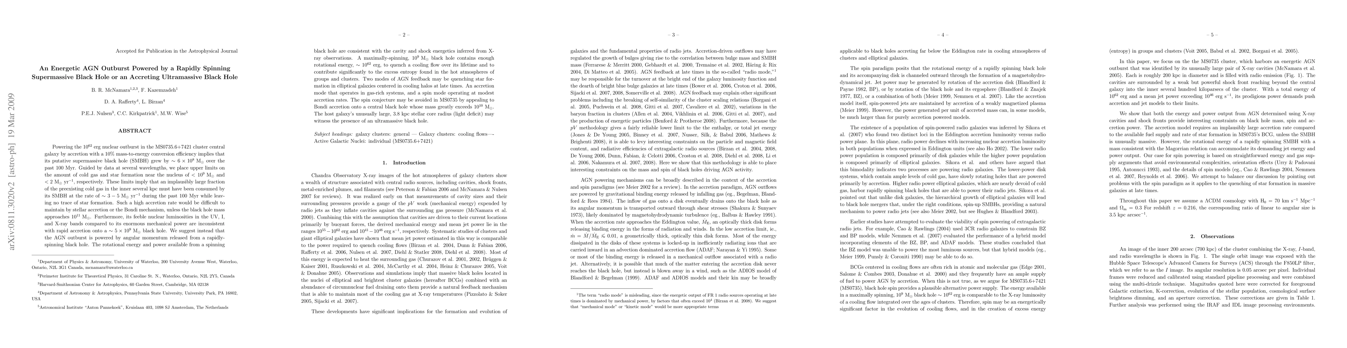 Powering the 10^62 erg nuclear outburst in the MS0735.6+7421 cluster central galaxy by accretion implies that its supermassive black hole (SMBH) grew by ~6x10^8 solar masses over the past 100 Myr. We place upper limits on the amount of cold gas and star formation near the nucleus of <10^9 solar masses and <2 solar masses per year, respectively. These limits imply that an implausibly large fraction of the preexisting cold gas in the bulge must have been consumed by its SMBH at the rate of ~3-5 solar masses per year while leaving no trace of star formation. Such a high accretion rate would be difficult to maintain by stellar accretion or the Bondi mechanism, unless the black hole mass approaches 10^11 solar masses. Its feeble nuclear luminosities in the UV, I, and X-ray bands compared to its enormous mechanical power are inconsistent with rapid accretion onto a ~5x10^9 solar mass black hole. We suggest instead that the AGN outburst is powered by a rapidly-spinning black hole. A maximally-spinning, 10^9 solar mass black hole contains enough rotational energy, ~10^62 erg, to quench a cooling flow over its lifetime and to contribute significantly to the excess entropy found in the hot atmospheres of groups and clusters. Two modes of AGN feedback may be quenching star formation in elliptical galaxies centered in cooling halos at late times. An accretion mode that operates in gas-rich systems, and a spin mode operating at modest accretion rates. The spin conjecture may be avoided in MS0735 by appealing to Bondi accretion onto a central black hole whose mass greatly exceeds 10^10 solar mass. The host galaxy's unusually large, 3.8 kpc stellar core radius (light deficit) may witness the presence of an ultramassive black hole.