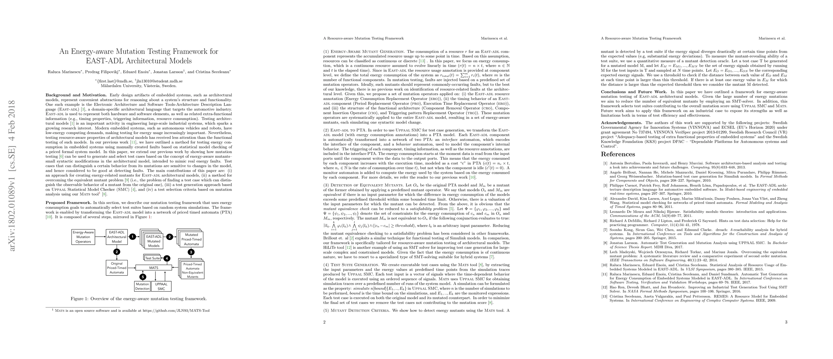 This paper presents an energy-aware mutation testing framework for EAST-ADL architectural models, focusing on generating energy-related mutants and overcoming the equivalent mutant problem. It employs UPPAAL SMC for test generation and uses a MATS-based mutation analysis for test selection.