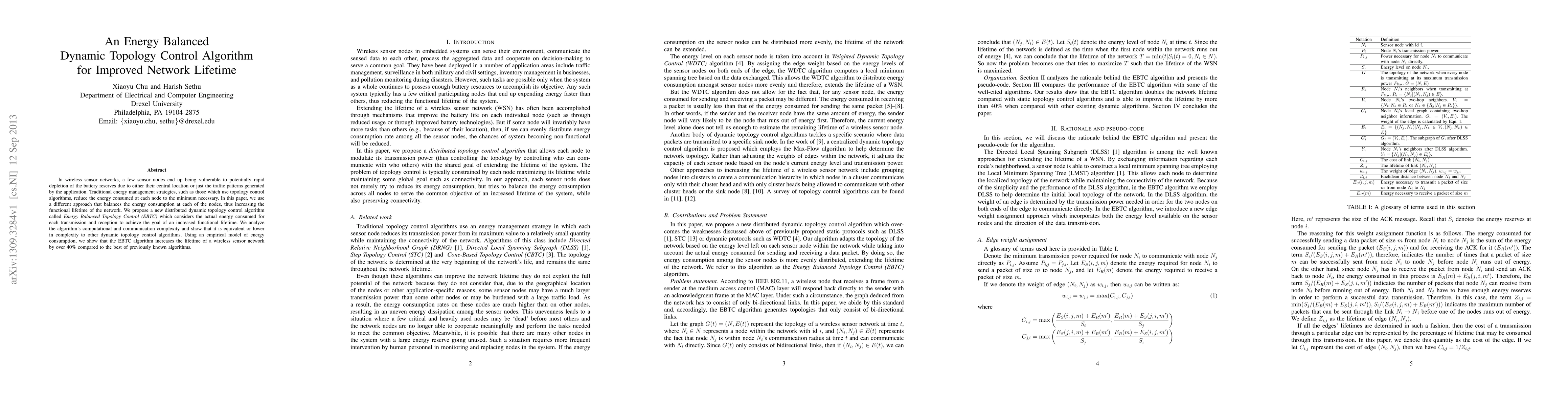 This paper proposes an Energy Balanced Topology Control (EBTC) algorithm to extend the functional lifetime of wireless sensor networks by balancing energy consumption across nodes. The EBTC algorithm's complexity is comparable to other dynamic topology control methods, and it achieves over 40% improvement in network lifetime compared to existing algorithms.