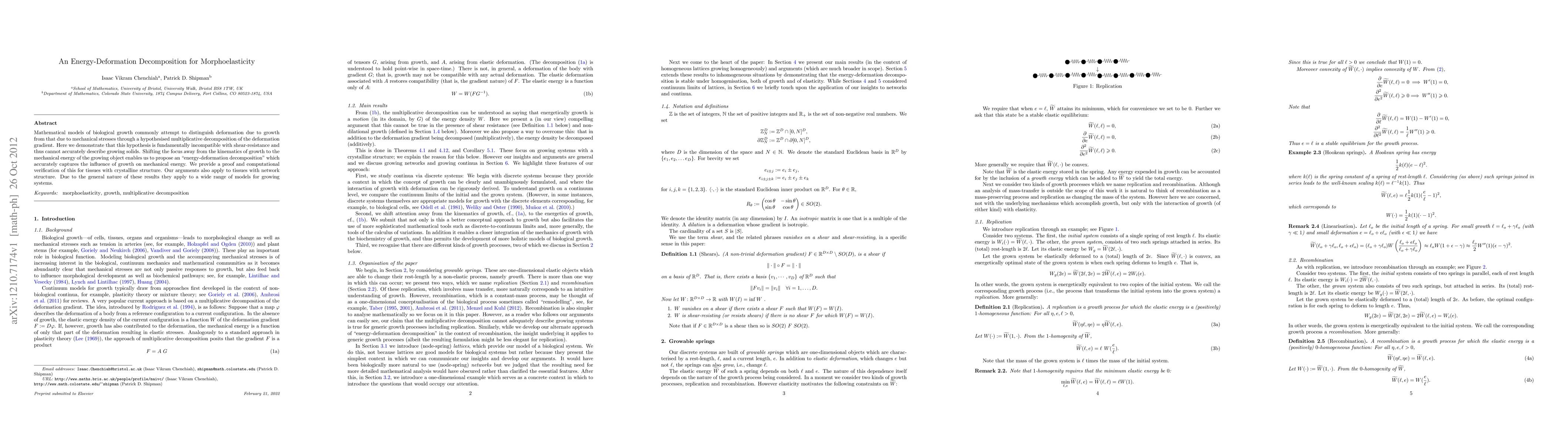 This paper argues that the traditional multiplicative decomposition of deformation gradient in biological growth models is flawed due to shear-resistance. It proposes an "energy-deformation decomposition" based on mechanical energy, validated computationally for tissues with crystalline and network structures, and applicable to various growing systems.