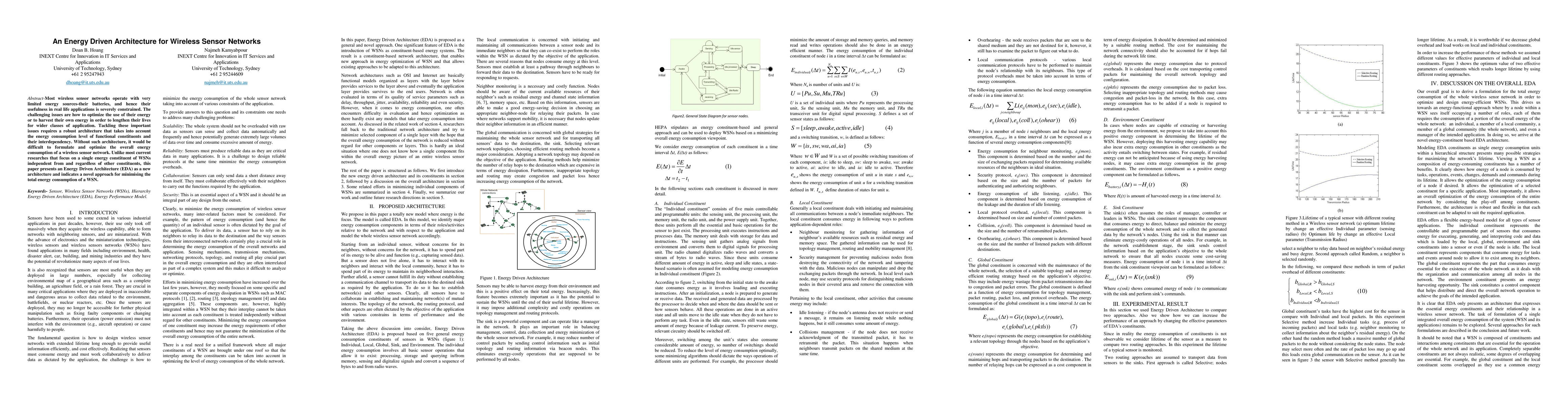 This paper proposes an Energy Driven Architecture (EDA) to optimize the energy consumption of wireless sensor networks by considering the interdependencies and energy levels of their functional components. Unlike existing methods, EDA aims to minimize total energy usage holistically rather than focusing on individual components.