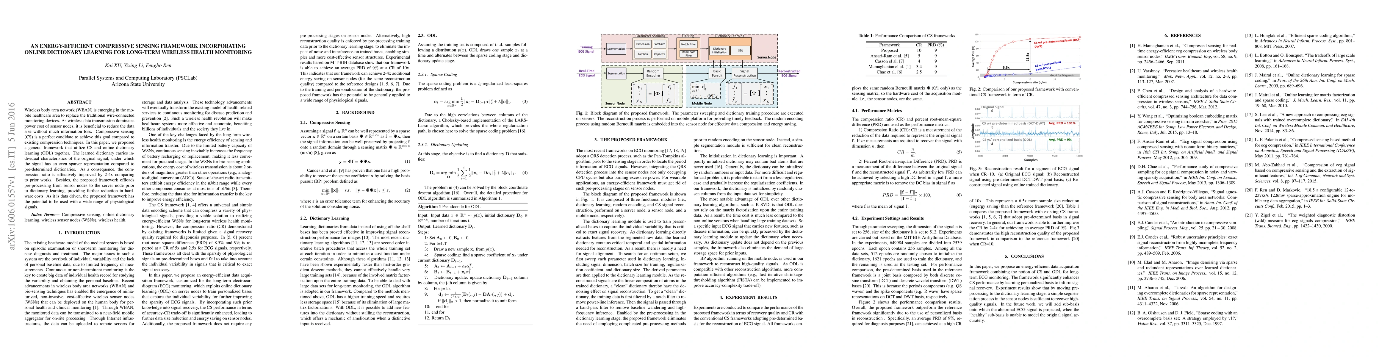This paper proposes an energy-efficient framework combining compressive sensing and online dictionary learning for wireless health monitoring, achieving a 2-4x improvement in compression ratio and reducing hardware costs by offloading pre-processing to the server. The method is adaptable to various physiological signals.