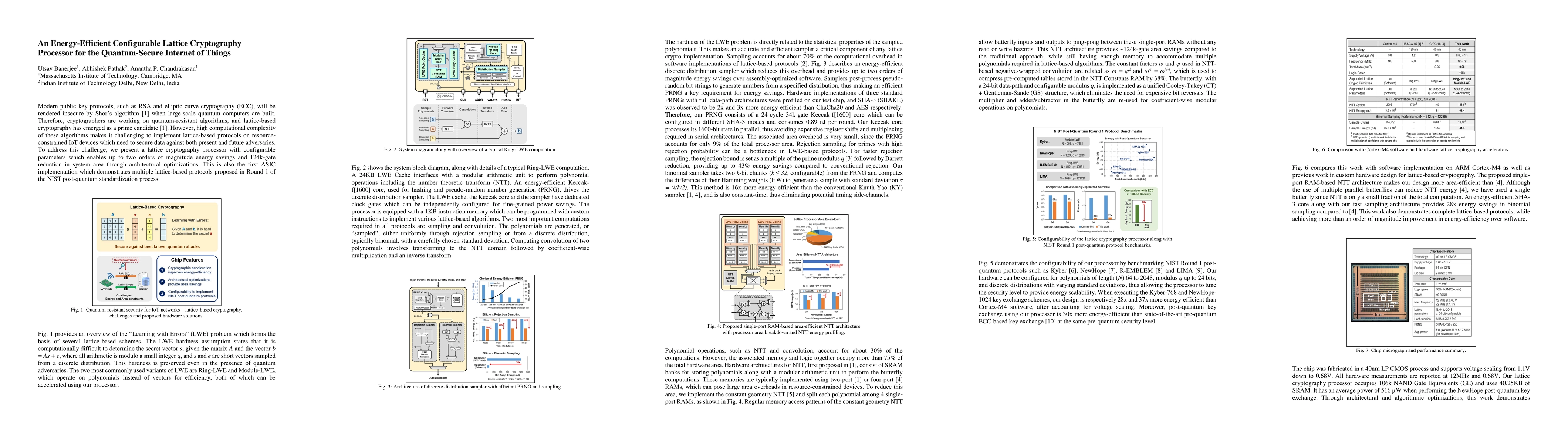 This paper presents a configurable lattice cryptography processor which enables quantum-resistant security protocols for IoT. Efficient sampling architectures, coupled with a low-power SHA-3 core, provide two orders of magnitude energy savings over software. A single-port RAM-based NTT architecture is proposed, which provides ~124k-gate area savings. This is the first ASIC implementation which demonstrates multiple lattice-based protocols proposed for NIST post-quantum standardization.