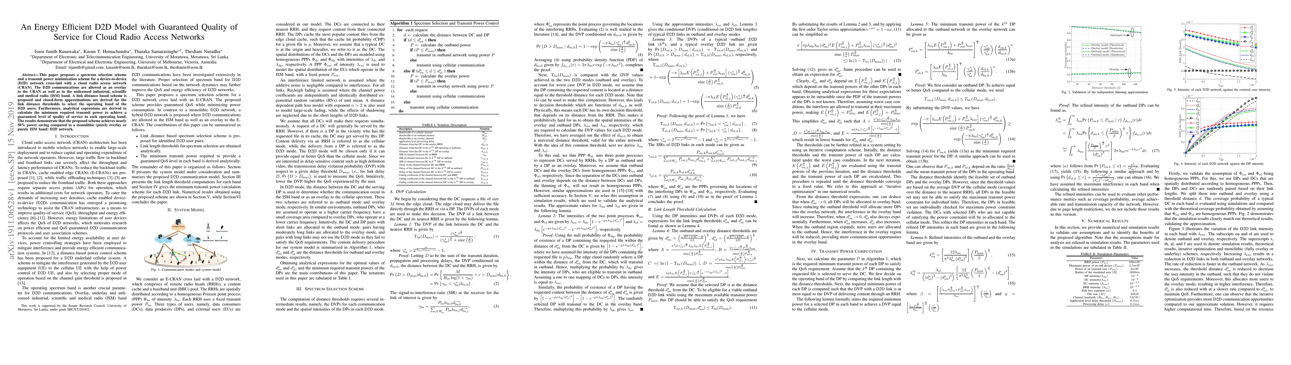 This paper proposes an energy-efficient D2D model for CRANs, utilizing a spectrum selection scheme and transmit power minimization to achieve guaranteed QoS. The model achieves nearly 50% power savings compared to traditional D2D networks.