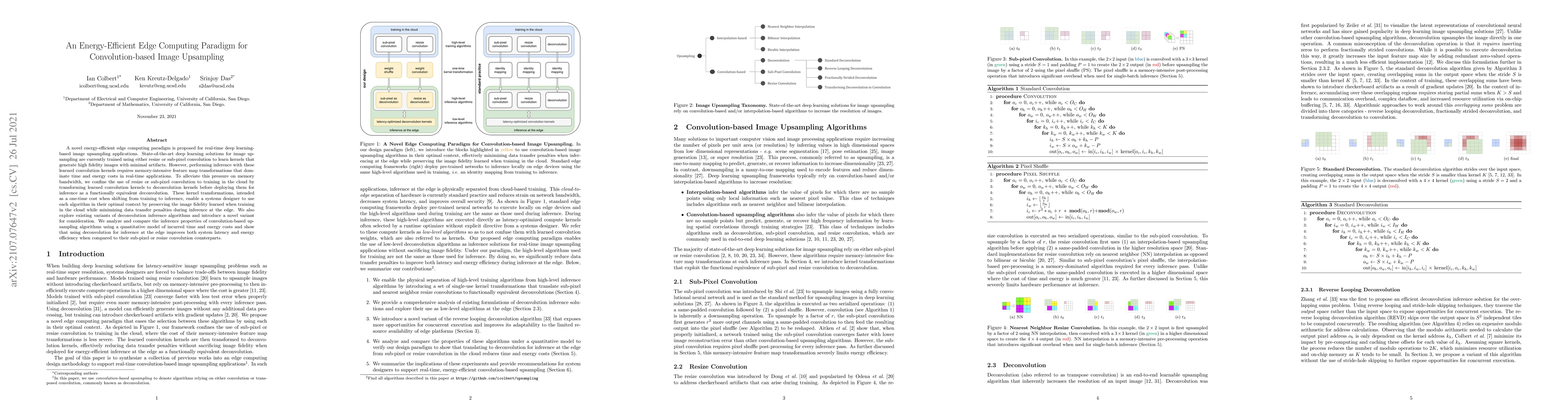 A novel energy-efficient edge computing paradigm is proposed for real-time deep learning-based image upsampling applications. State-of-the-art deep learning solutions for image upsampling are currently trained using either resize or sub-pixel convolution to learn kernels that generate high fidelity images with minimal artifacts. However, performing inference with these learned convolution kernels requires memory-intensive feature map transformations that dominate time and energy costs in real-time applications. To alleviate this pressure on memory bandwidth, we confine the use of resize or sub-pixel convolution to training in the cloud by transforming learned convolution kernels to deconvolution kernels before deploying them for inference as a functionally equivalent deconvolution. These kernel transformations, intended as a one-time cost when shifting from training to inference, enable a systems designer to use each algorithm in their optimal context by preserving the image fidelity learned when training in the cloud while minimizing data transfer penalties during inference at the edge. We also explore existing variants of deconvolution inference algorithms and introduce a novel variant for consideration. We analyze and compare the inference properties of convolution-based upsampling algorithms using a quantitative model of incurred time and energy costs and show that using deconvolution for inference at the edge improves both system latency and energy efficiency when compared to their sub-pixel or resize convolution counterparts.