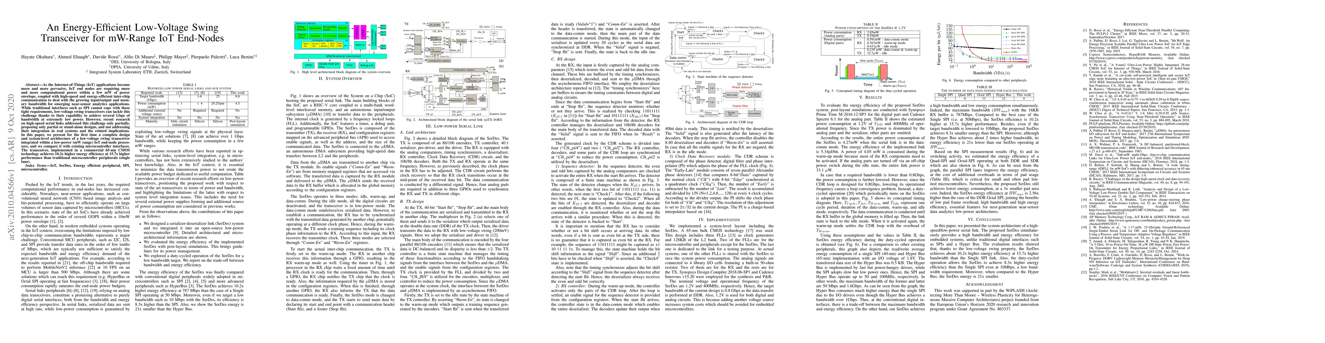 This paper presents a complete low-voltage swing transceiver design for mW-range IoT end-nodes, achieving significantly higher energy efficiency and performance compared to traditional interfaces like SPI. The transceiver integrates seamlessly into low-power IoT processors, demonstrating 10.2x better energy efficiency and 15.7x higher performance.