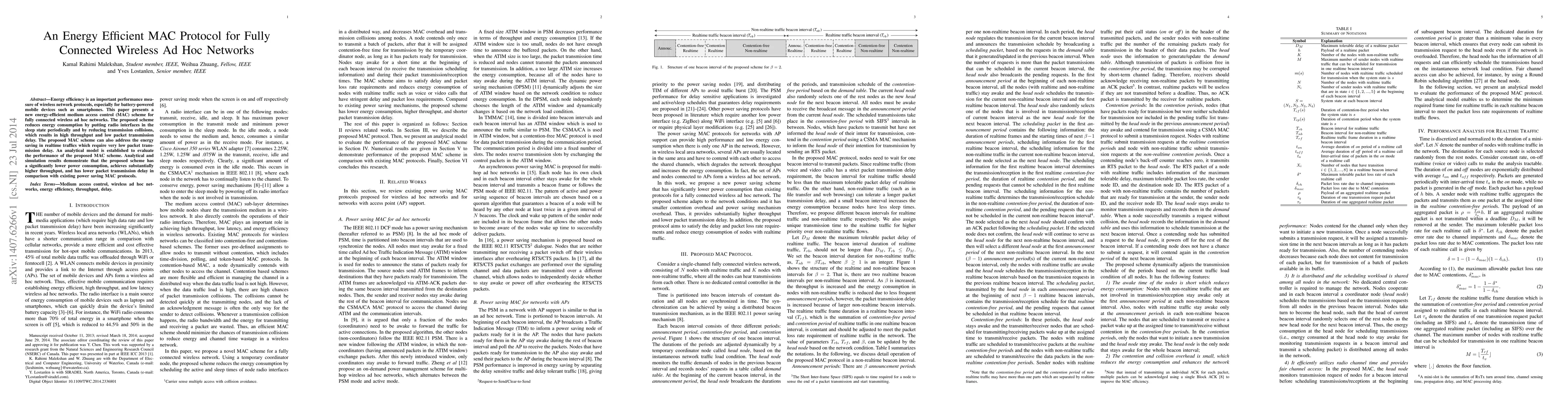 Energy efficiency is an important performance measure of wireless network protocols, especially for battery-powered mobile devices such as smartphones. This paper presents a new energy-efficient medium access control (MAC) scheme for fully connected wireless ad hoc networks. The proposed scheme reduces energy consumption by putting radio interfaces in the sleep state periodically and by reducing transmission collisions, which results in high throughput and low packet transmission delay. The proposed MAC scheme can also address the energy saving in realtime traffics which require very low packet transmission delay. An analytical model is established to evaluate the performance of the proposed MAC scheme. Analytical and simulation results demonstrate that the proposed scheme has a significantly lower power consumption, achieves substantially higher throughput, and has lower packet transmission delay in comparison with existing power saving MAC protocols.