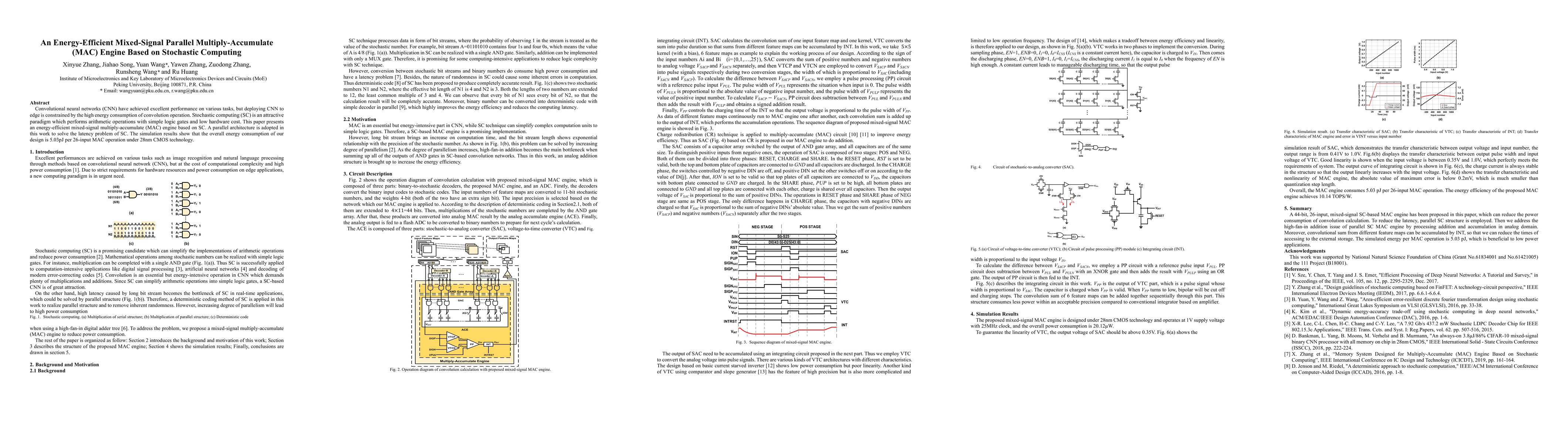 Convolutional neural networks (CNN) have achieved excellent performance on various tasks, but deploying CNN to edge is constrained by the high energy consumption of convolution operation. Stochastic computing (SC) is an attractive paradigm which performs arithmetic operations with simple logic gates and low hardware cost. This paper presents an energy-efficient mixed-signal multiply-accumulate (MAC) engine based on SC. A parallel architecture is adopted in this work to solve the latency problem of SC. The simulation results show that the overall energy consumption of our design is 5.03pJ per 26-input MAC operation under 28nm CMOS technology.