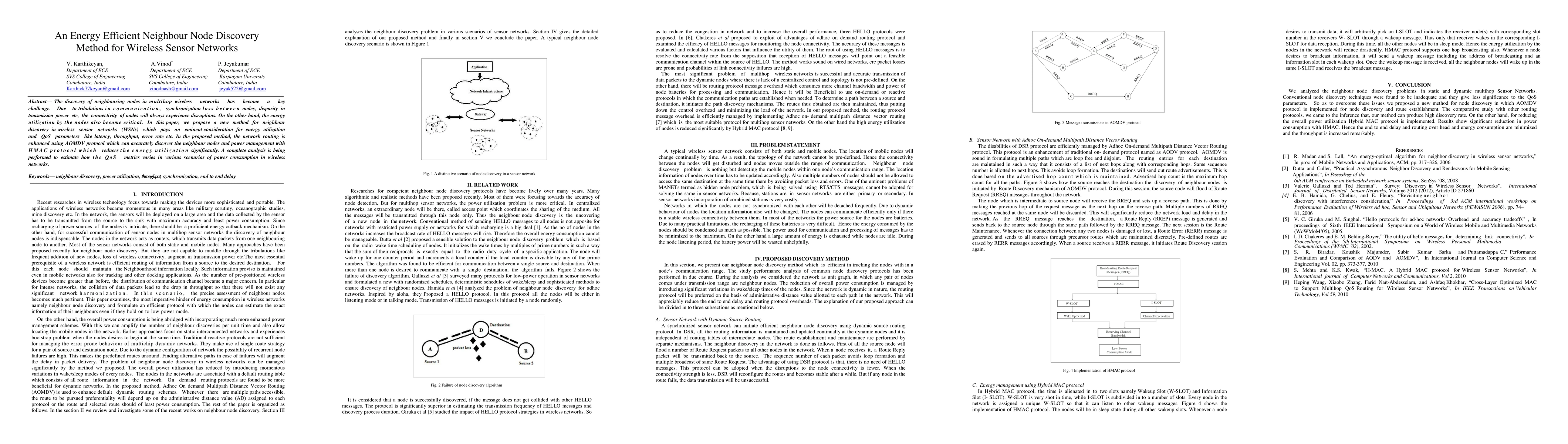 This paper proposes an energy-efficient neighbour node discovery method for wireless sensor networks, utilizing the AOMDV protocol for enhanced network routing and the HMAC protocol for effective power management, aiming to improve QoS metrics like latency and throughput while minimizing energy consumption. The method's impact on various power consumption scenarios is thoroughly analyzed.