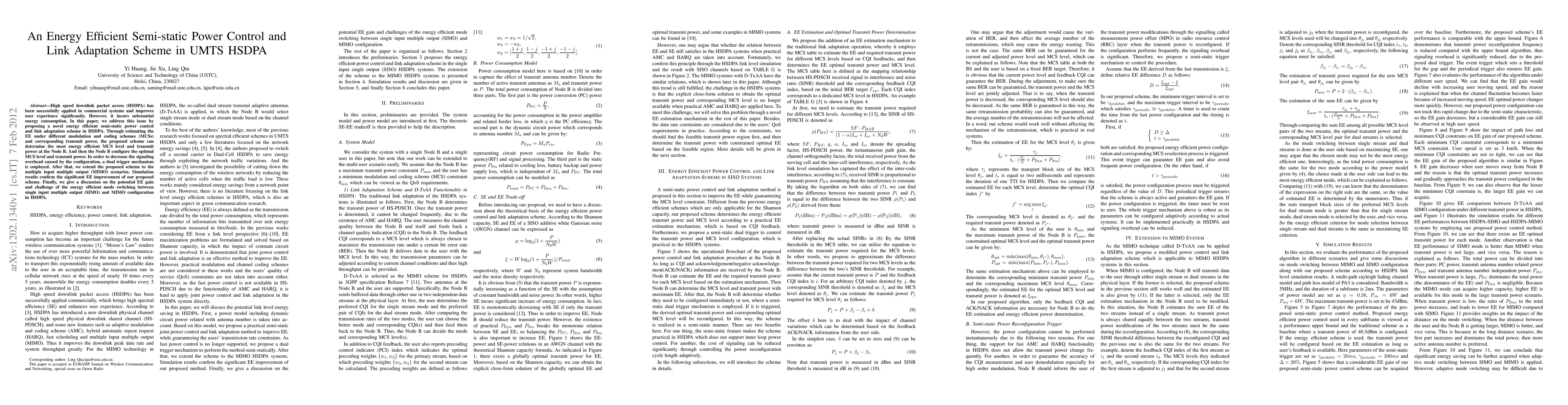 High speed downlink packet access (HSDPA) has been successfully applied in commercial systems and improves user experience significantly. However, it incurs substantial energy consumption. In this paper, we address this issue by proposing a novel energy efficient semi-static power control and link adaptation scheme in HSDPA. Through estimating the EE under different modulation and coding schemes (MCSs) and corresponding transmit power, the proposed scheme can determine the most energy efficient MCS level and transmit power at the Node B. And then the Node B configure the optimal MCS level and transmit power. In order to decrease the signaling overhead caused by the configuration, a dual trigger mechanism is employed. After that, we extend the proposed scheme to the multiple input multiple output (MIMO) scenarios. Simulation results confirm the significant EE improvement of our proposed scheme. Finally, we give a discussion on the potential EE gain and challenge of the energy efficient mode switching between single input multiple output (SIMO) and MIMO configuration in HSDPA.