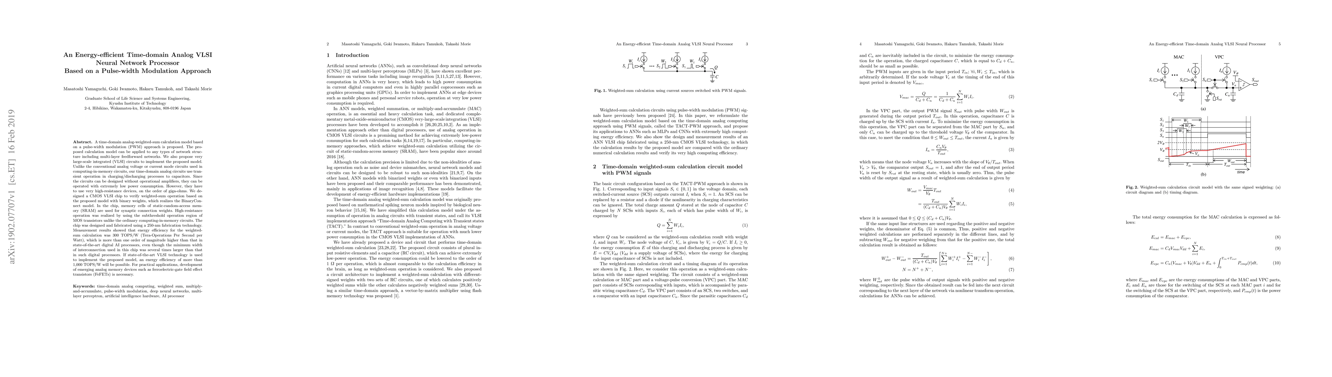 A time-domain analog-weighted-sum calculation model based on a pulse-width modulation (PWM) approach is proposed. The proposed calculation model can be applied to any types of network structure including multi-layer feedforward networks. We also propose very large-scale integrated (VLSI) circuits to implement the proposed model. Unlike the conventional analog voltage or current mode circuits used in computing-in-memory circuits, our time-domain analog circuits use transient operation in charging/discharging processes to capacitors. Since the circuits can be designed without operational amplifiers, they can be operated with extremely low power consumption. However, they have to use very high-resistance devices, on the order of giga-ohms. We designed a CMOS VLSI chip to verify weighted-sum operation based on the proposed model with binary weights, which realizes the BinaryConnect model. In the chip, memory cells of static-random-access memory (SRAM) are used for synaptic connection weights. High-resistance operation was realized by using the subthreshold operation region of MOS transistors unlike the ordinary computing-in-memory circuits. The chip was designed and fabricated using a 250-nm fabrication technology. Measurement results showed that energy efficiency for the weighted-sum calculation was 300~TOPS/W (Tera-Operations Per Second per Watt), which is more than one order of magnitude higher than that in state-of-the-art digital AI processors, even though the minimum width of interconnection used in this chip was several times larger than that in such digital processors. If state-of-the-art VLSI technology is used to implement the proposed model, an energy efficiency of more than 1,000~TOPS/W will be possible. For practical applications, development of emerging analog memory devices such as ferroelectric-gate field effect transistors (FeFETs) is necessary.
