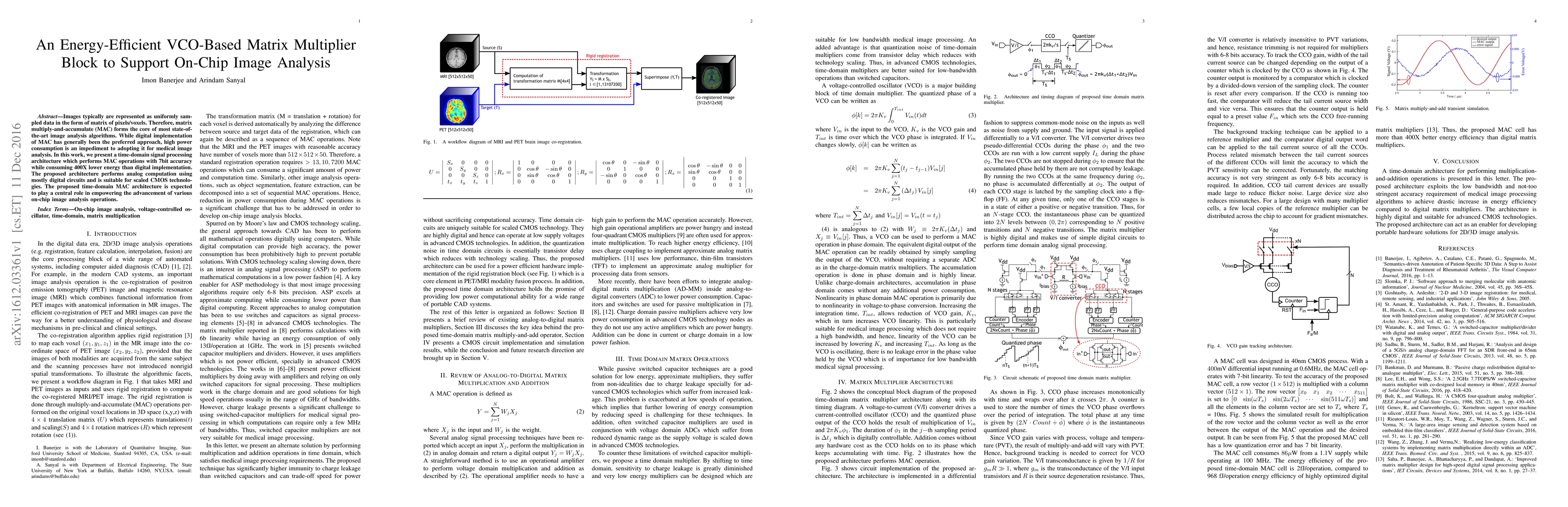 Images typically are represented as uniformly sampled data in the form of matrix of pixels/voxels. Therefore, matrix multiply-and-accumulate (MAC) forms the core of most state-of-the-art image analysis algorithms. While digital implementation of MAC has generally been the preferred approach, high power consumption is an impediment to adopting it for medical image analysis. In this work, we present a time-domain signal processing architecture which performs MAC operations with 7bit accuracy while consuming 400X lower energy than digital implementation. The proposed architecture performs analog computation using mostly digital circuits and is suitable for scaled CMOS technologies. The proposed time-domain MAC architecture is expected to play a central role in empowering the advancement of various on-chip image analysis operations.
