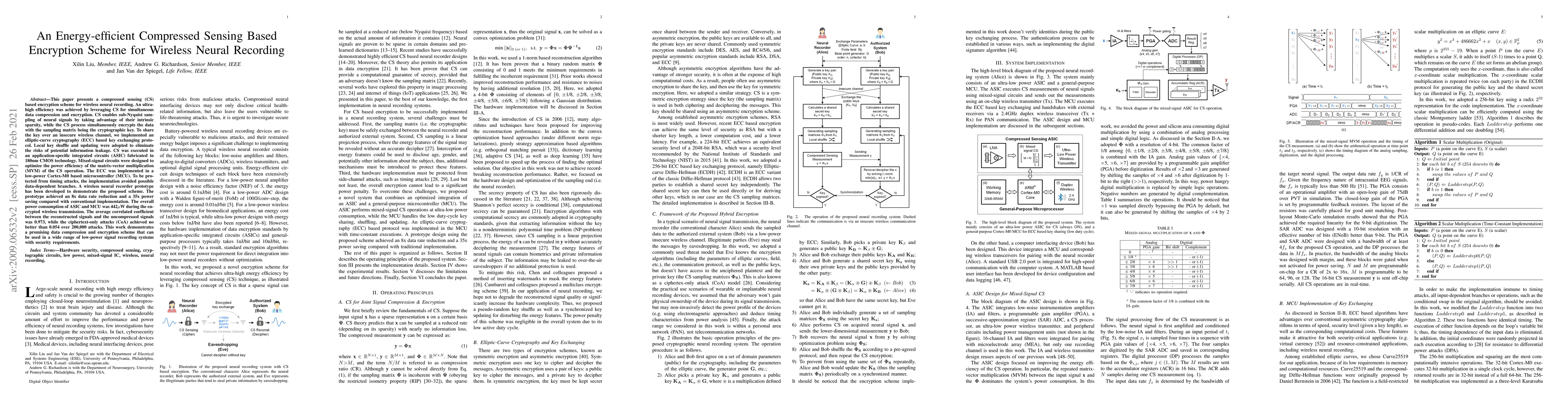 This paper introduces an energy-efficient wireless neural recording system using compressed sensing for data compression and encryption. The system achieves ultra-high efficiency through sub-Nyquist sampling and secures data with an elliptic-curve cryptography-based key exchange, demonstrating significant power savings and high data fidelity.