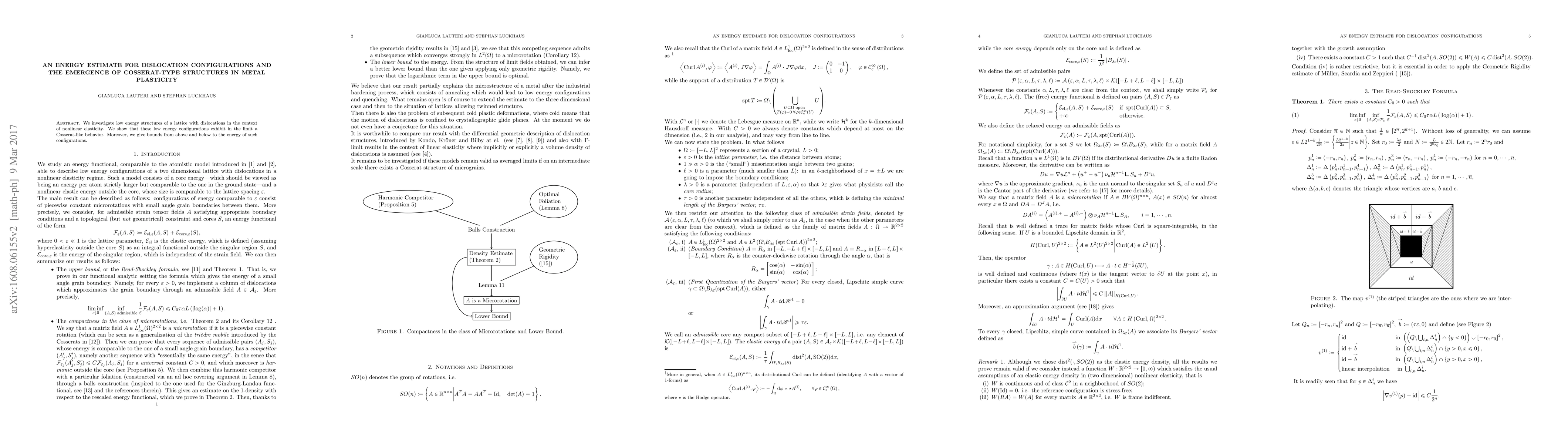 We investigate low energy structures of a lattice with dislocations in the context of nonlinear elasticity. We show that these low energy configurations exhibit in the limit a Cosserat-like behavior. Moreover, we give bounds from above and below to the energy of such configurations.