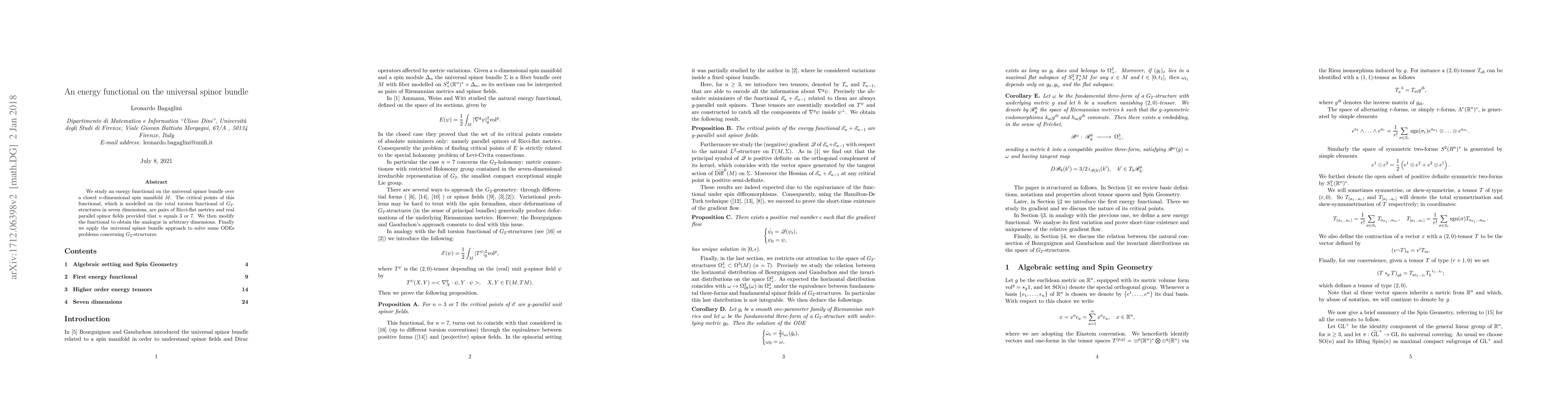 This paper investigates an energy functional on the universal spinor bundle over closed spin manifolds, focusing on its critical points linked to Ricci-flat metrics and parallel spinor fields in dimensions 3 and 7. It extends this approach to arbitrary dimensions and applies it to solve ODE problems related to $G_2$-structures.