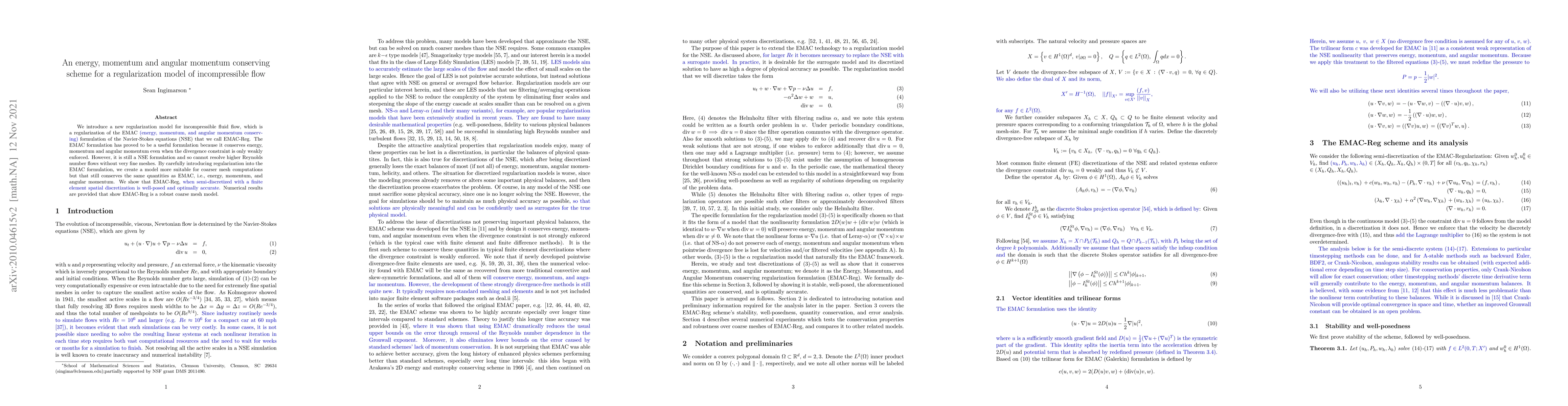This paper presents a new regularization model, EMAC-Reg, for incompressible fluid flow that conserves energy, momentum, and angular momentum while allowing for coarser mesh computations. The model is derived from the EMAC formulation of the Navier-Stokes equations, and numerical results demonstrate its robustness and accuracy.
